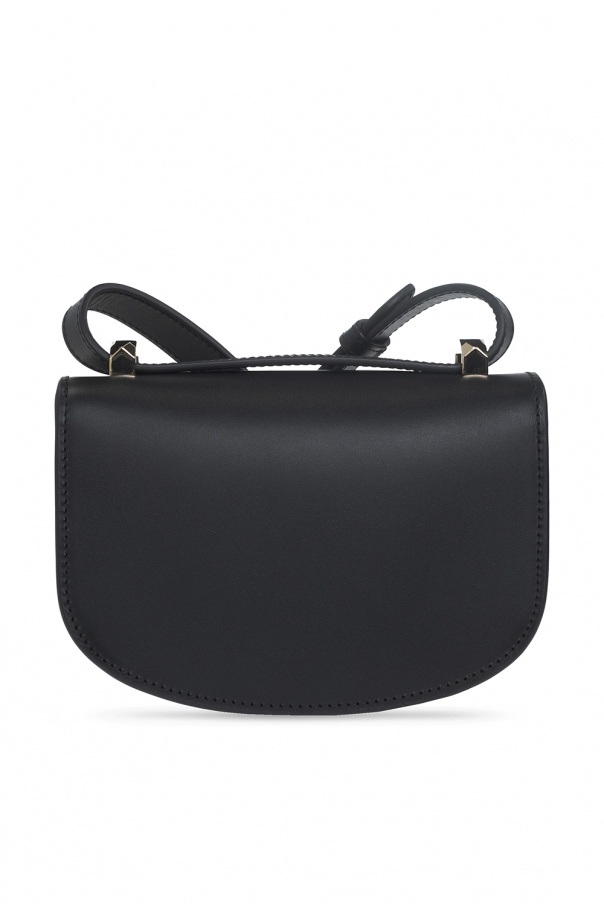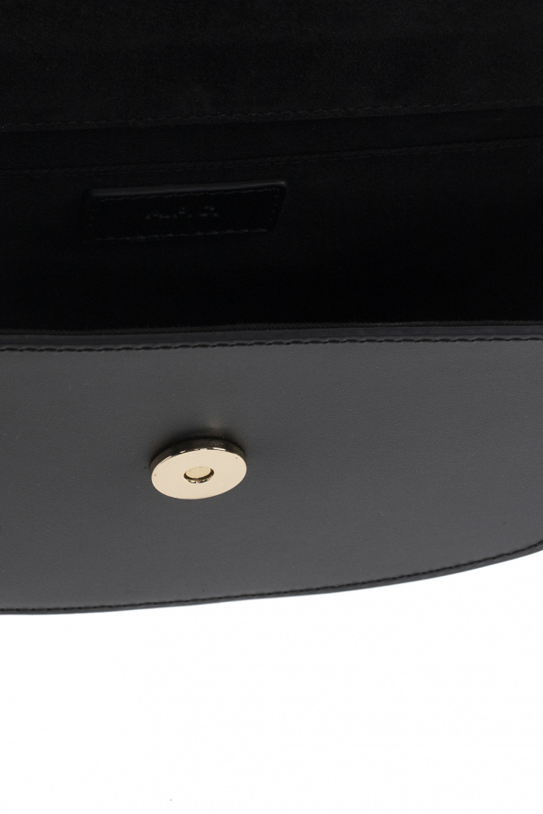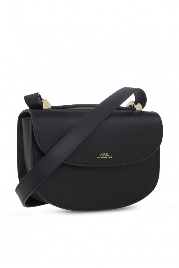 Black ‘Geneve Mini’ shoulder bag from A.P.C. Made of cow leather, this model features a magnetic snap and is complete with an embossed logo pattern in gold-tone, adjustable strap, silver-tone metal hardware and one internal compartment with one slip pocket.