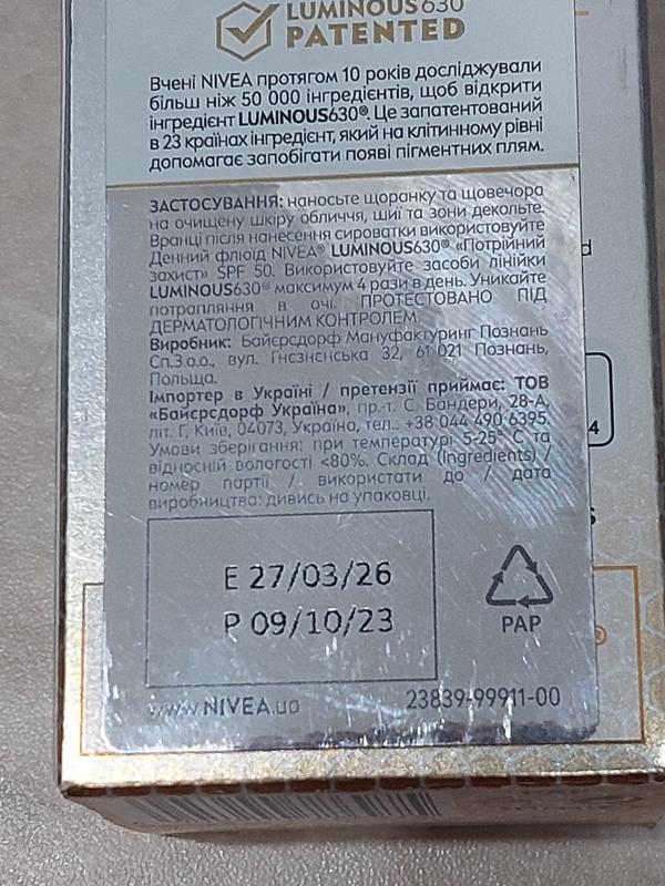 NIVEA Luminous 630 Serum. Объем 30 ml.Состояние: НовоеЦвет:- Белый