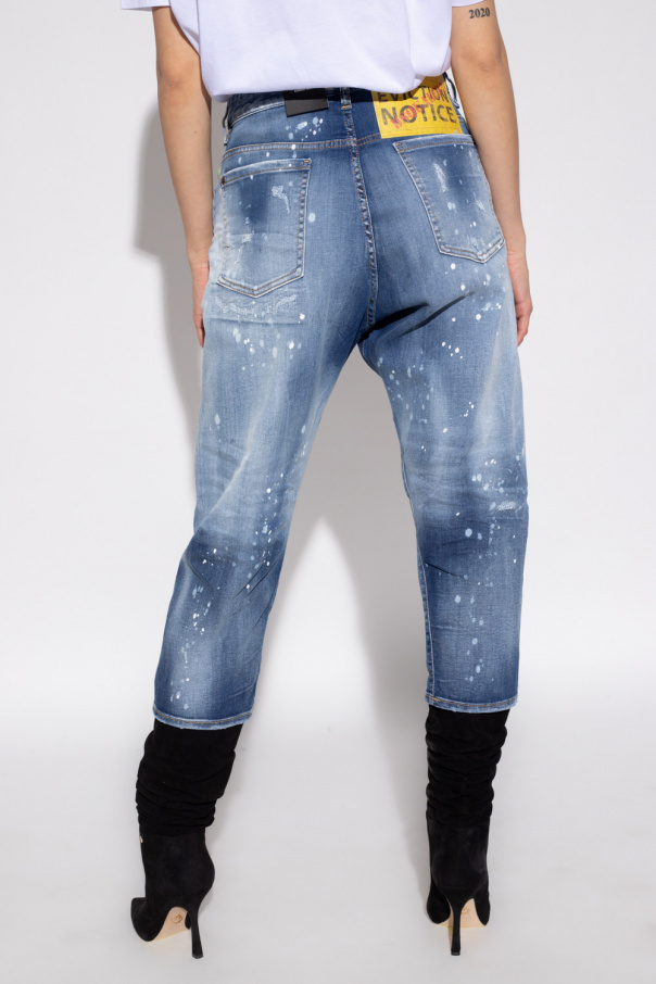 Blue ‘Kawaii Jean’ jeans from Dsquared2. Fastened with buttons, this pair falls down with wide cropped tapered legs and is complete with a white paint splatter effect, three front pockets and two back pockets.