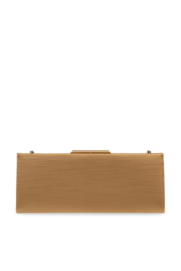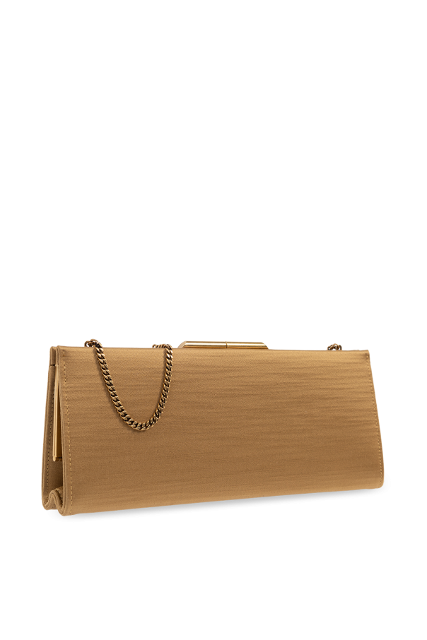 Beige ‘Midnight’ clutch from Saint Laurent. Made of satin. Fastened with a snap, this model features a long chain, antique silver-tone metal hardware and one internal compartment with one slip pocket.