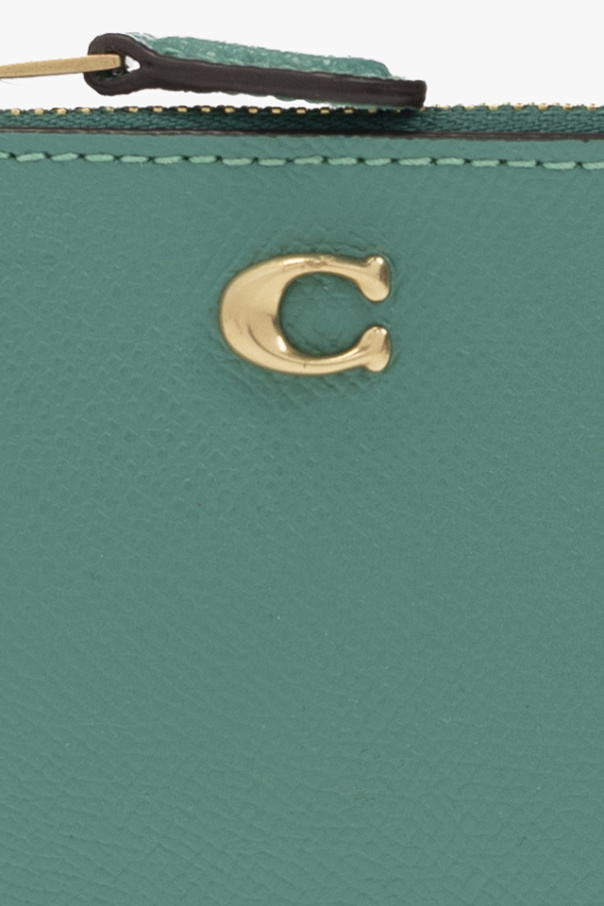 Green card holder from Coach. Made of textured leather, this item features a zip fastening, metal logo, three document compartments at the back, internal key ring and gold-tone metal hardware.