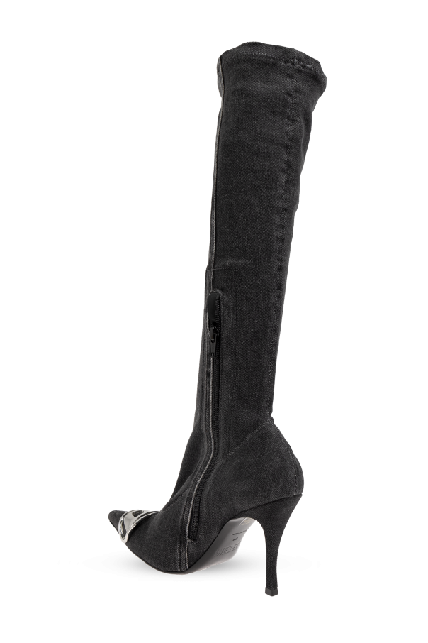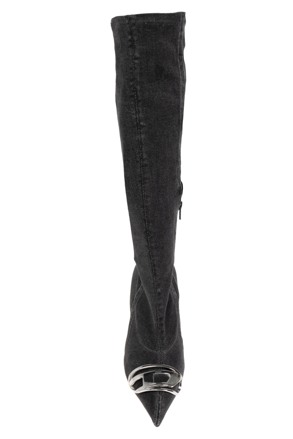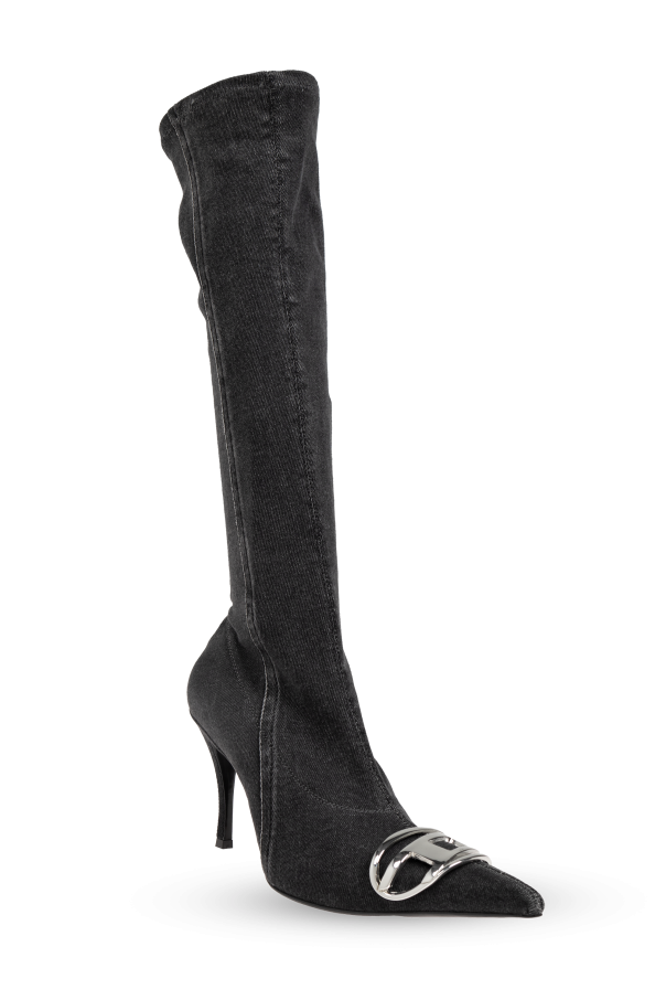 Introducing the exquisite D-VENUS boots from the renowned fashion house, Diesel. These knee-high boots epitomize sophistication with their classic silhouette, featuring sleek stiletto heels and sharply pointed toes. Crafted from a dark gray, elastic material that contours elegantly to the leg, the boots promise both comfort and style. The D-VENUS boots boast a prominent metal embellishment in the shape of the letter \'D\' on the front, symbolizing the designer\'s iconic branding. A convenient side zipper enhances ease of wear, seamlessly integrating functionality with high fashion. Why Choose This Product? Elegant Design: The dark gray hue and modern aesthetic make these boots perfect for formal occasions or evening outings. Premium Materials: Exterior made from elastic material for a snug fit, with a leather interior and sole for luxury and durability. Distinctive Details: Features a stylish metal \'D\' embellishment and a practical side zipper for easy wear. Renowned Brand: Designed by Diesel, a brand celebrated for its exceptional quality and innovative designs.