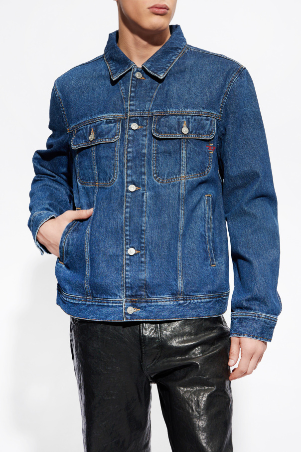 Navy blue ‘D-BARCY’ denim jacket from Diesel. Made of cotton, this style showcases an embroidered red logo, button fastenings, two slip pockets and two flapped pockets with buttons on the front, and long sleeves with button cuffs.