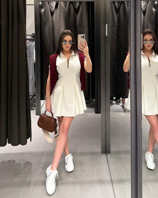 Короткое облегающее платье. Рубашечный воротник-поло и короткие рукава с контрастной окантовкой в рубчик. Крой в стиле годет внизу. Застегивается на пуговицы спереди.Состояние: НовоеЦвет:- Коричневый