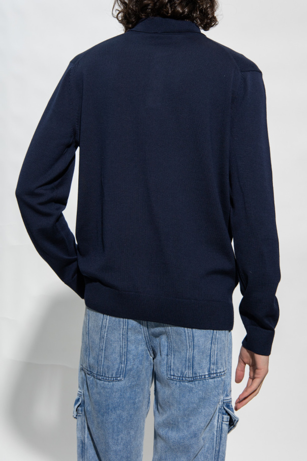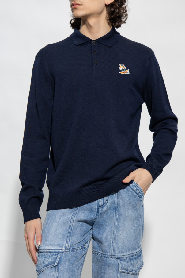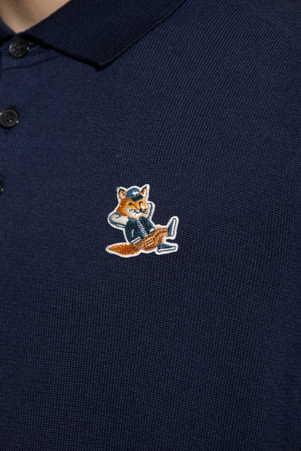 Navy polo shirt from Maison Kitsune. Made of wool, this design features buttons at the neck, logo patch and ribbed trims at the hem and cuffs.