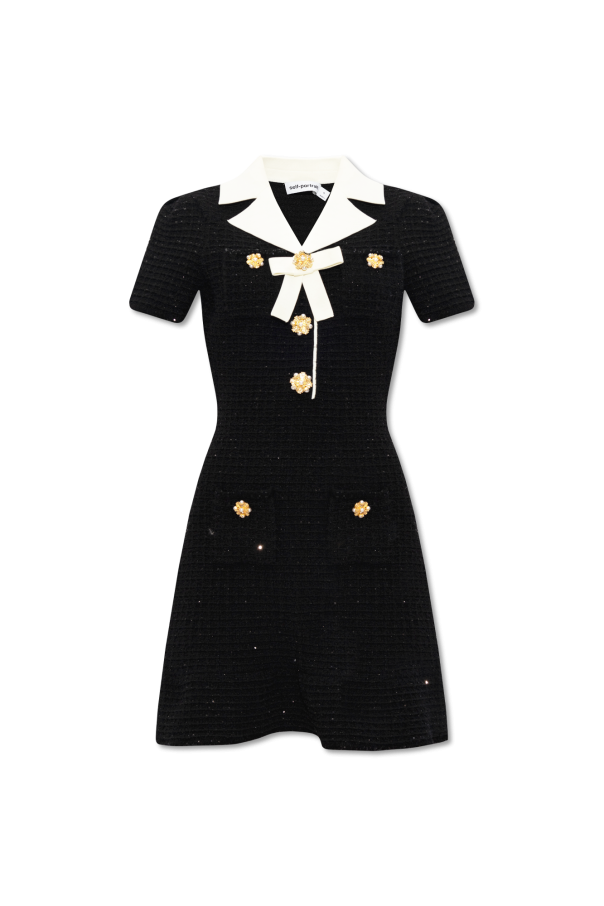 Black bodycon dress from Self Portrait. Made of a sequinned wool blend, this style is embellished with a bow brooch and features a collared neckline, detachable shoulder padding, shorts sleeves and four snap-fastened pockets.