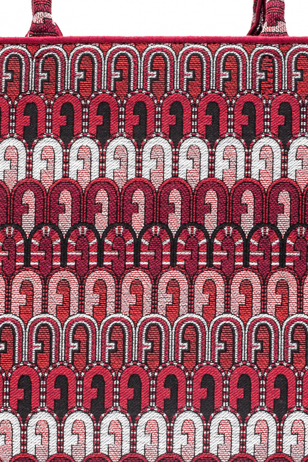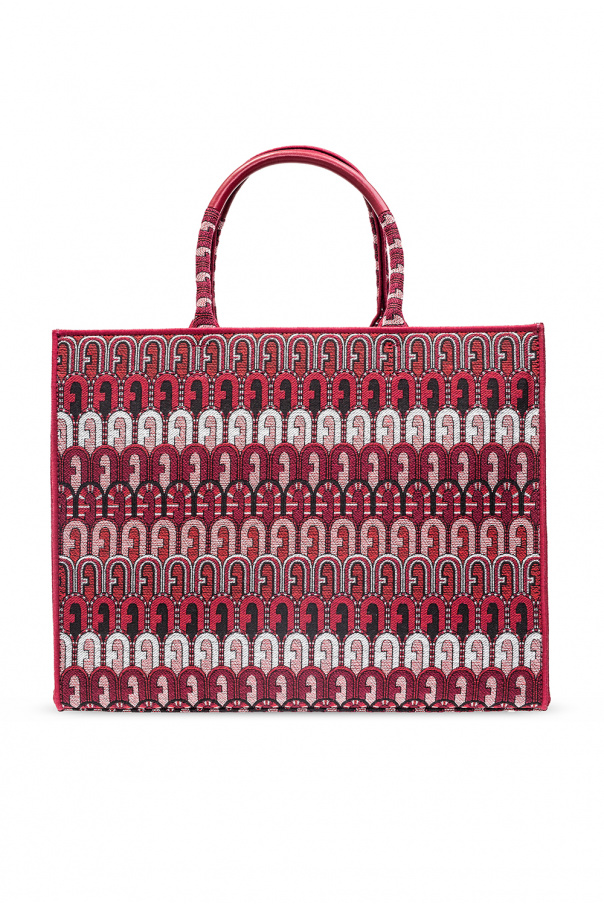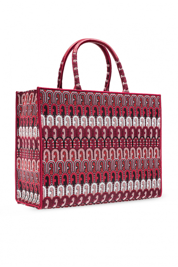 Red and maroon ‘Opportunity’ handbag from Furla. Distinguished with an embroidered pattern, this item features two half-round handles and one internal compartment with one slip pocket and one zip pocket.