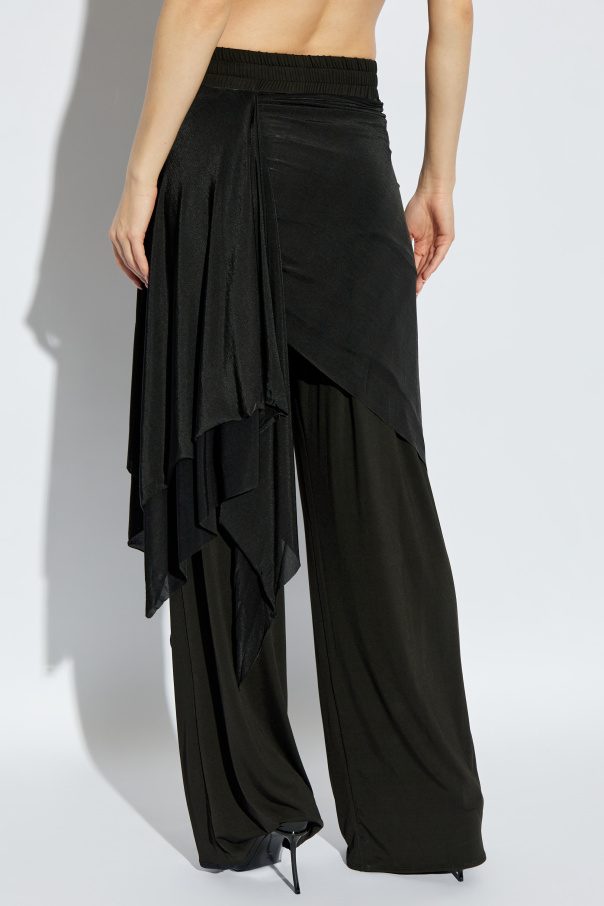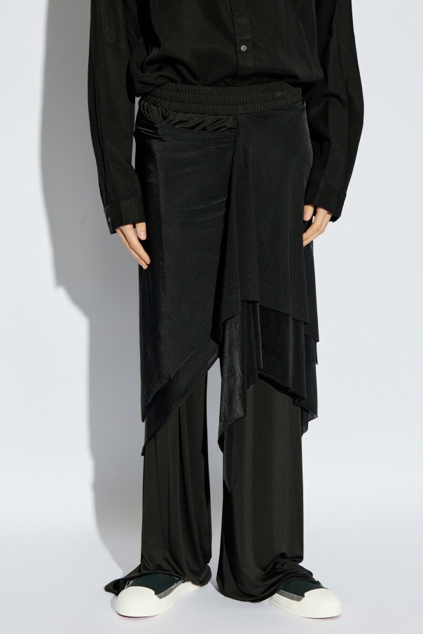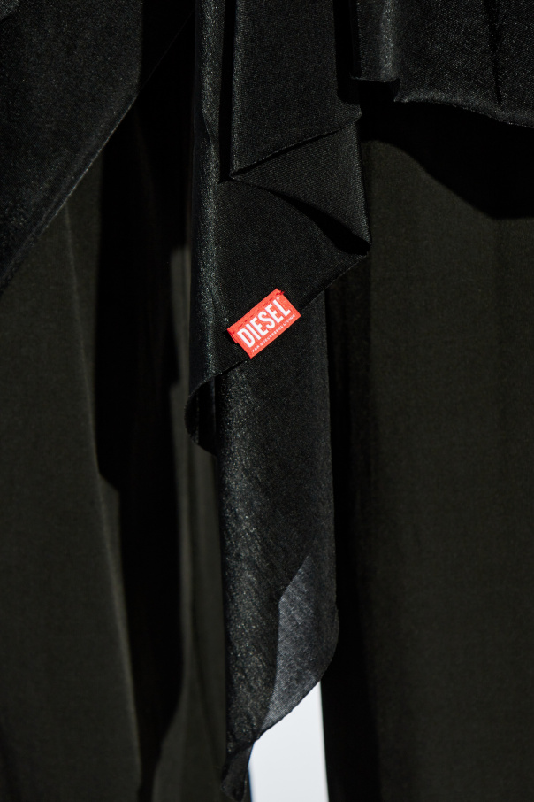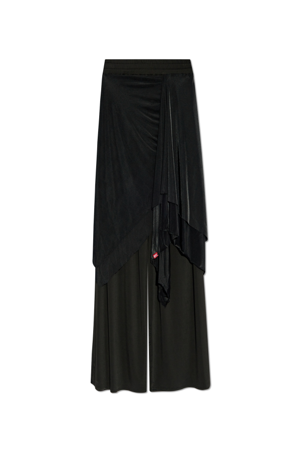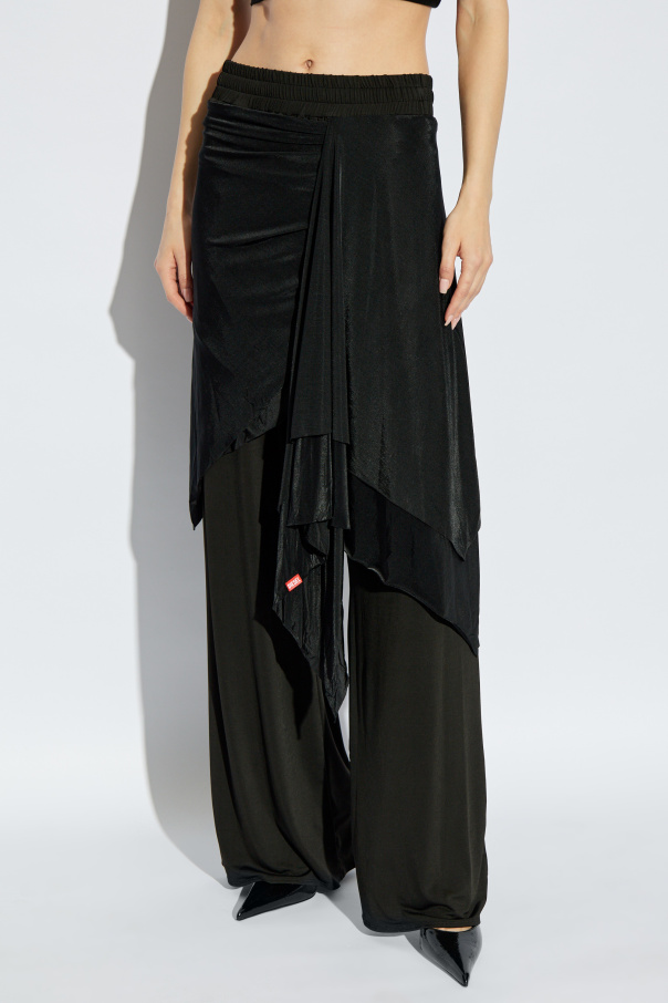 Introducing the exquisite P-FRIZZA-PLAIN pants from the illustrious Diesel collection, a paragon of sartorial elegance and contemporary design. These pants feature a loose fit with wide legs, accentuated by an asymmetrical, draped overlay that exudes a modern and original aesthetic. Crafted from a lightweight, breathable blend, these pants offer unparalleled comfort and freedom of movement. The dominant black hue imparts a timeless and versatile elegance, suitable for any sophisticated wardrobe. A subtle yet striking detail, the small, red \"DIESEL\" label, discreetly adorns the garment, adding a touch of designer flair. Designed as a unisex piece, these pants are perfect for creating casual yet trendy ensembles, suitable for both men and women. Why Choose These Pants? Exquisite design by renowned Italian brand Diesel. Unisex style, offering versatility for all. Comfortable, breathable material for ease of wear. Fashion-forward draped asymmetric overlay. Timeless black color for easy pairing.