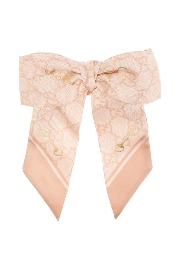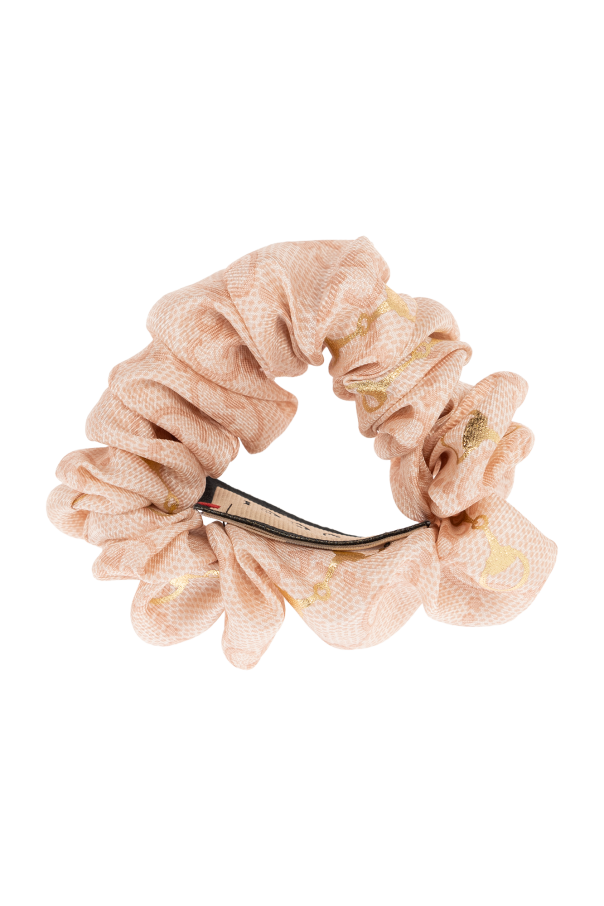 Two-piece scrunchie set in light pink from Gucci. Both items are embellished with a monogram pattern and gold-tone horsebit motif. One has a decorative bow.