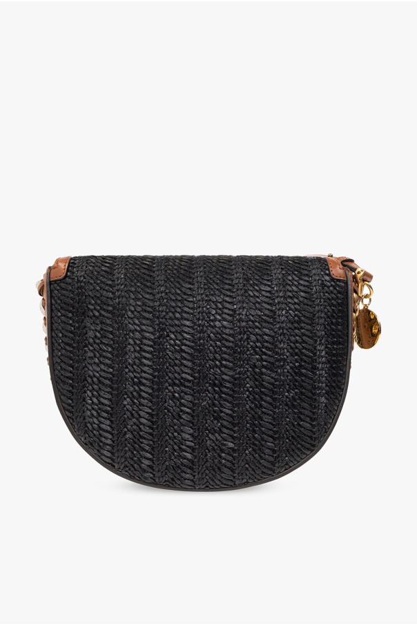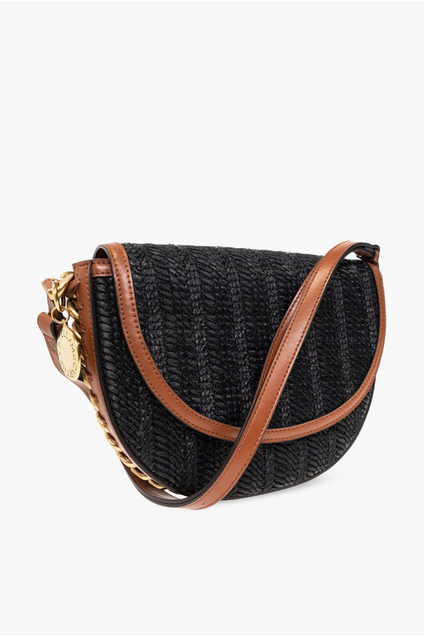 Black and brown ‘Frayme Medium’ shoulder bag from Stella McCartney. Crafted from faux raffia and vegan leather, this design fastens with a snap and features chain and cord detailing, a round logo charm, gold-tone and silver-tone metal hardware and one internal compartment with a slip pocket.