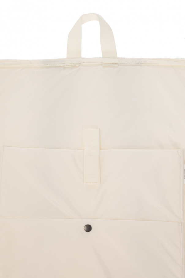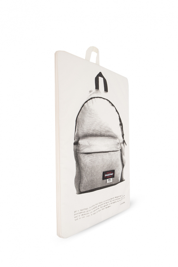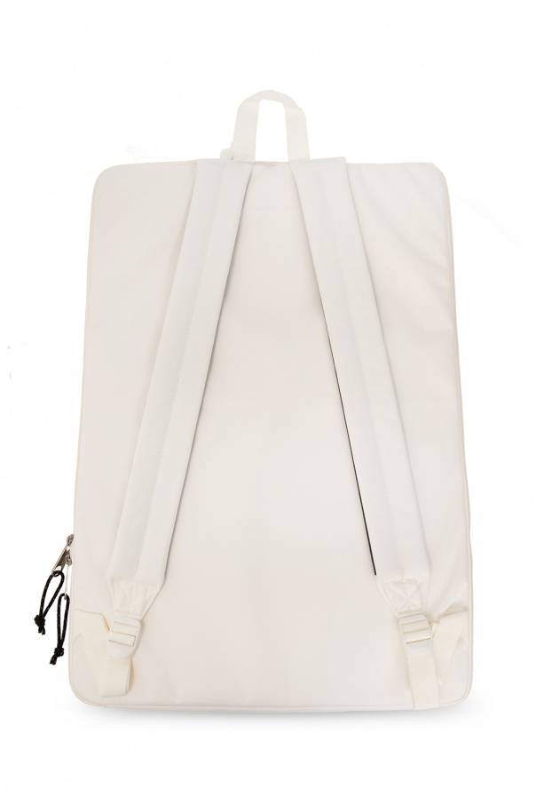 White backpack from MM6 Maison Margiela x Eastpak. Emblazoned with a grey and black graphic print and logo patches, this design fastens via a two-way zip and features a half-round handle, adjustable shoulder straps, dark silver-tone metal hardware and one internal compartment with one velcro pocket and one snap-fastened pocket.