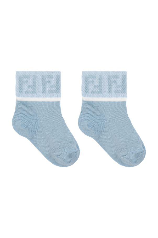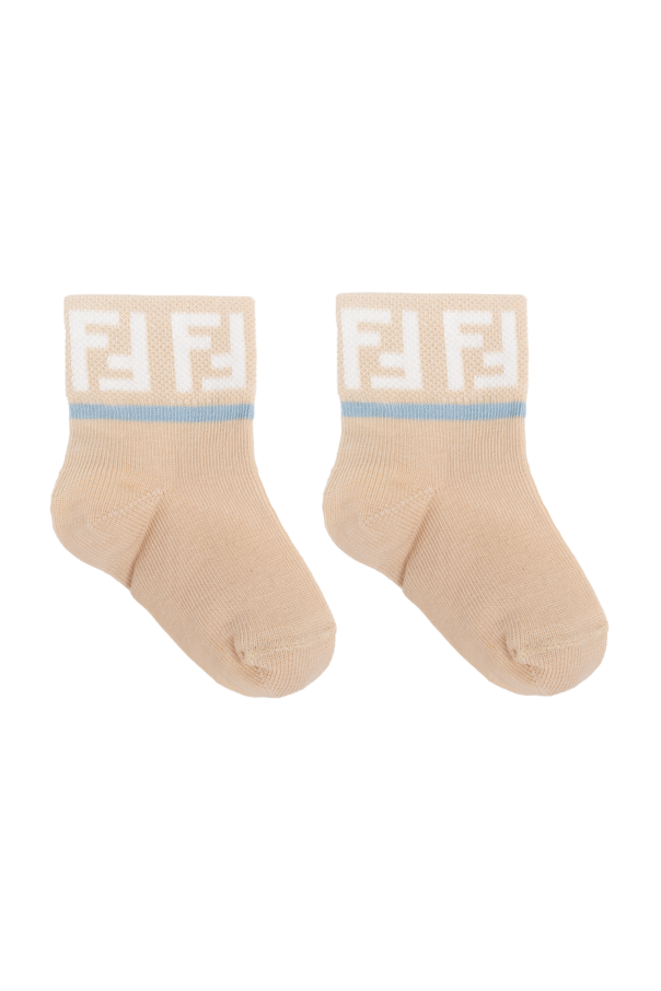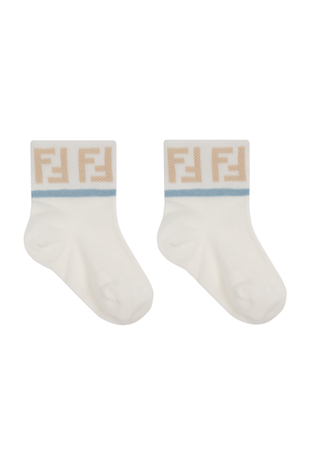 Introducing the epitome of luxury in everyday wear: the Fendi Kids Five-Pack Socks. This exclusive collection showcases a palette of understated elegance with hues of beige, white, and blue, each pair adorned with the iconic designer logo in contrasting colors. The logo, a repetitive pattern of two letters, is prominently featured on the cuff, making a bold statement of sophistication and brand recognition. These socks are crafted with an exceptional blend of materials, featuring 86% Cotton, 11% Polyamide, and 3% Elastane, ensuring not only a smooth and soft texture but also durability and stretch for a perfect fit. The classic design, with a dedicated foot area and an elastic cuff, promises comfort and a secure fit, making these socks a versatile addition to any wardrobe. Designed by the renowned Fendi Kids, this set is a testament to the brand\'s commitment to luxury and quality, appealing to those who appreciate designer accessories in their daily ensemble. Why Purchase This Product? Designer Appeal: Instantly recognizable Fendi Kids logo for an elevated style statement. Luxurious Composition: High-quality blend of cotton, polyamide, and elastane for supreme comfort and longevity. Versatile Palette: Neutral colors to complement any outfit, making them perfect for daily wear or special occasions. Perfect Fit: Classic design with elastic cuffs ensures a snug, comfortable fit for all-day wear.