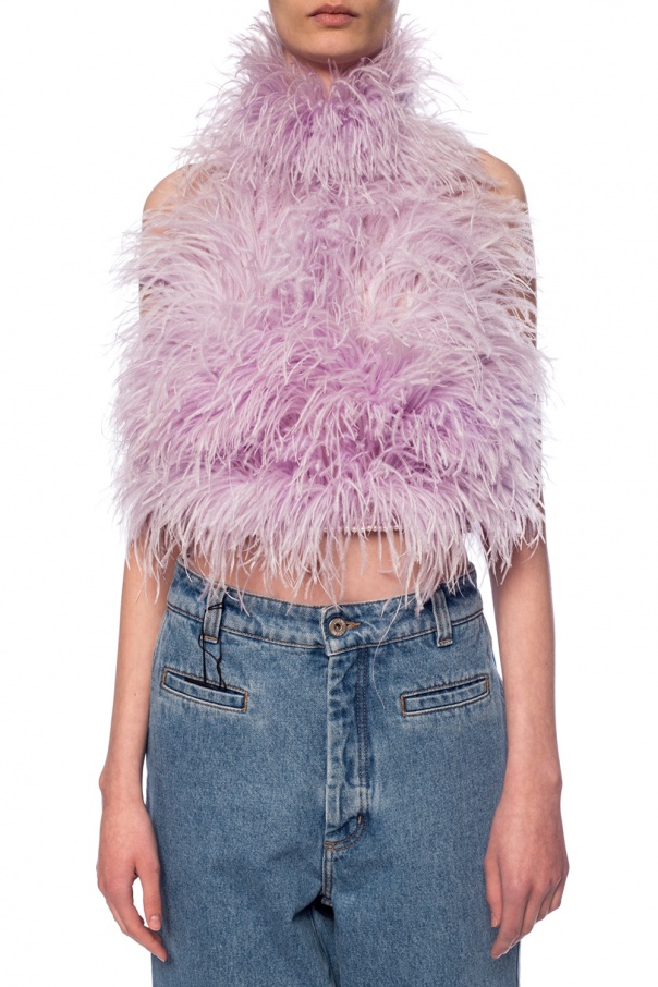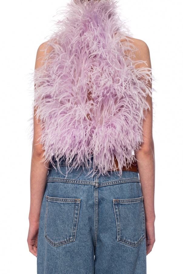 Light purple sleeveless top from The Attico. Made of ostrich feathers. Fastened via zip and hooks on the back. Detailed with embellished hem.