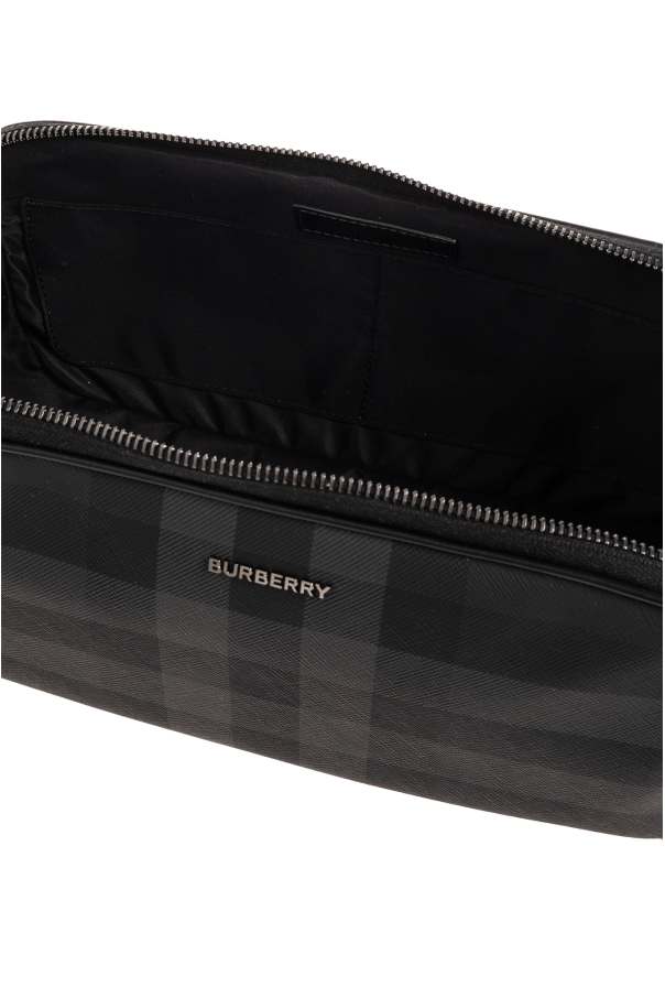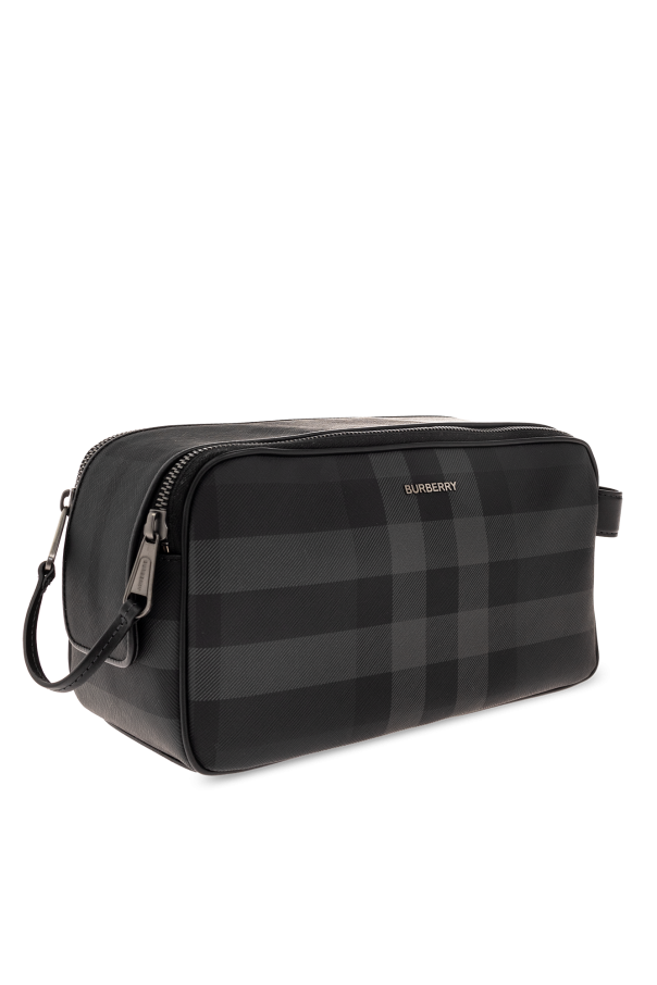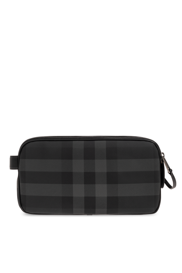 Dark grey and black wash bag from Burberry. Made from coated canvas and leather, this design features zip fastenings, a check pattern, logo detail, side handle, dark silver-tone metal hardware and one internal compartment with two slip pockets.