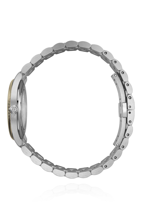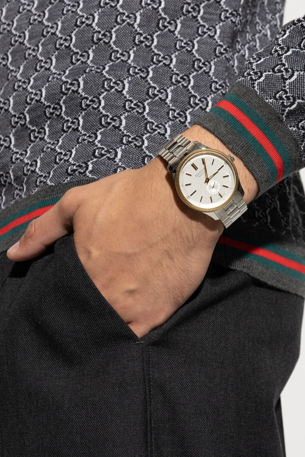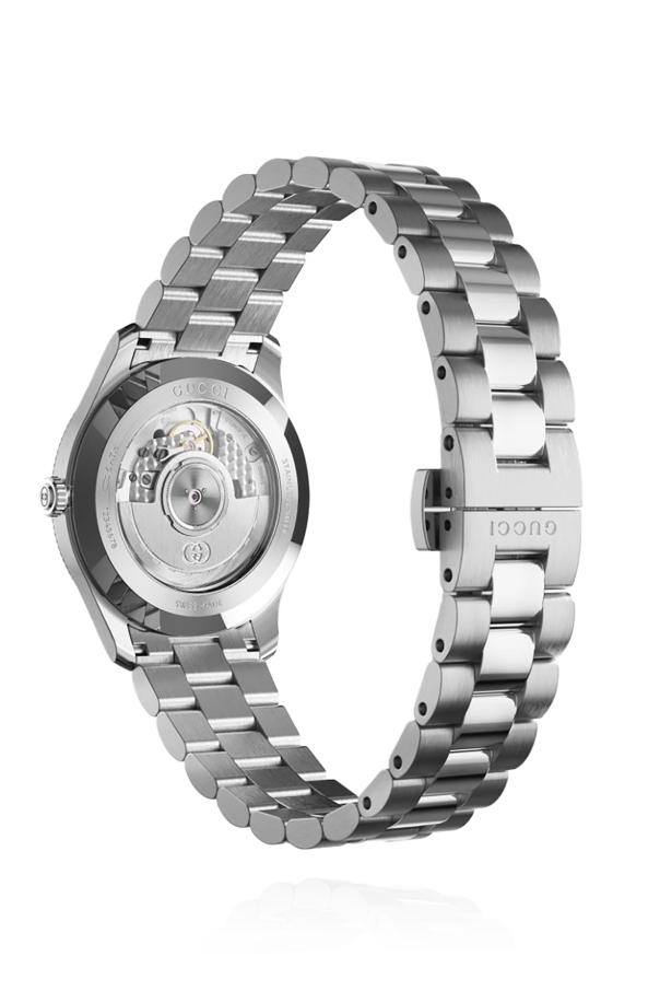 The G-Timeless watch by Gucci is an epitome of refined elegance and modern sophistication. Designed as a unisex accessory, this timepiece is a testament to impeccable craftsmanship and timeless aesthetics. The watch features a round stainless steel case that exudes durability and resistance to corrosion. The silver metal bracelet, composed of polished links, seamlessly integrates with the case, offering a harmonious blend of strength and elegance. A golden bezel around the dial enhances its luxurious appeal. The silver dial is adorned with gold hour indexes and a small seconds indicator at 6 o\'clock, ensuring clarity and precision. The iconic \"GUCCI\" logo is proudly displayed at the 12 o\'clock position, adding an element of prestige. The crown is thoughtfully placed on the right side of the case, allowing easy manual time adjustments. Adding to its allure, the watch showcases a transparent case back, revealing the intricate mechanics within, underscoring the fine artistry involved in its creation. The bracelet clasp is engraved with the \"GUCCI\" logo, a nod to its authenticity and heritage. Why You Should Buy This Product? Elegant and timeless design suitable for any occasion. Durable stainless steel construction. Luxury gold accents for an added touch of sophistication. Visible mechanical movement highlighting exquisite craftsmanship. Unisex style, perfect for any wardrobe.