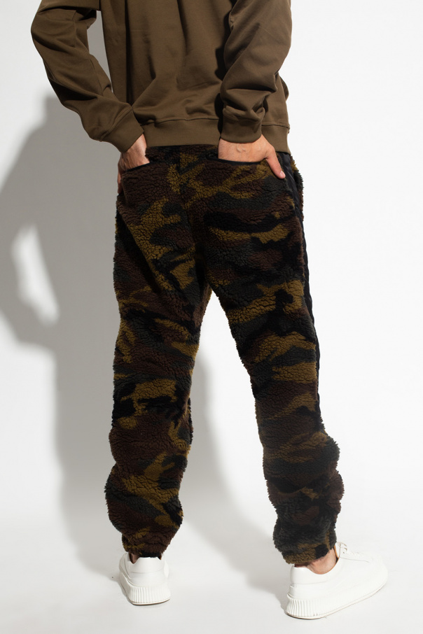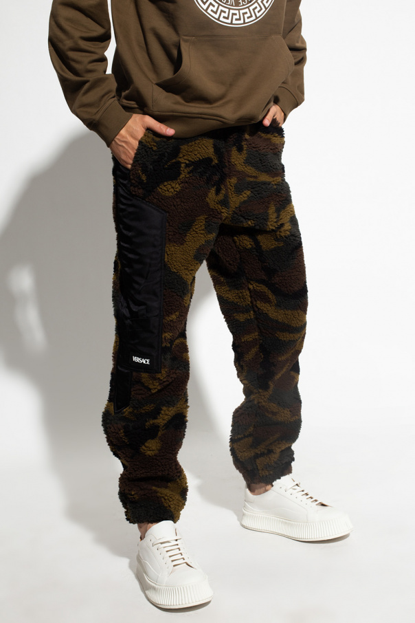Black, green and brown trousers from Versace. Trimmed with camo-printed faux fur, this pair features a drawcord-adjustable waist and three pockets accompanied by a logo appliqué on the front.