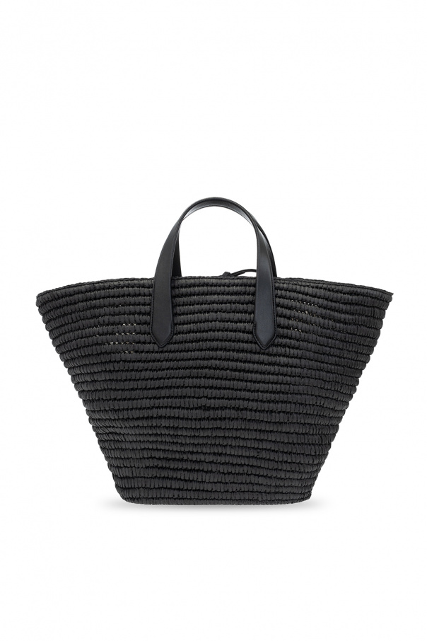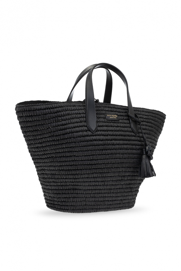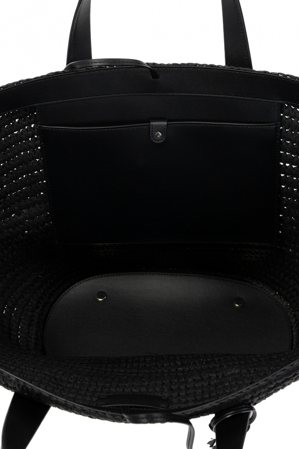Black woven shopper bag from Kate Spade. Fastened with ties, this design features a logo appliqué, two half-round handles, silver-tone metal hardware and one internal compartment with one snap-fastened pocket.