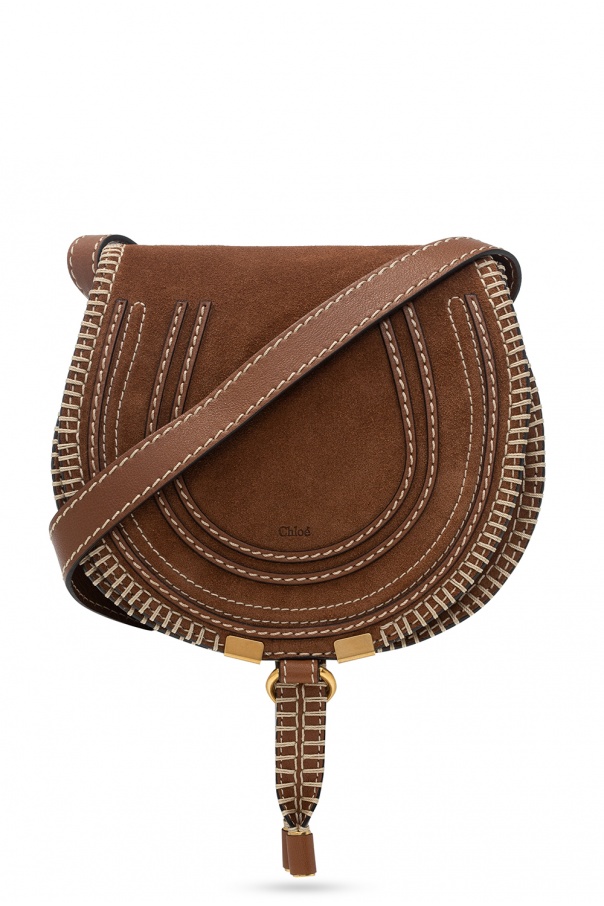 Brown ‘Marcie’ shoulder bag from Chloé. Crafted from suede with leather trims, this design features decorative tie fastening, embossed logo, adjustable shoulder strap and one internal compartment with two slip pockets.