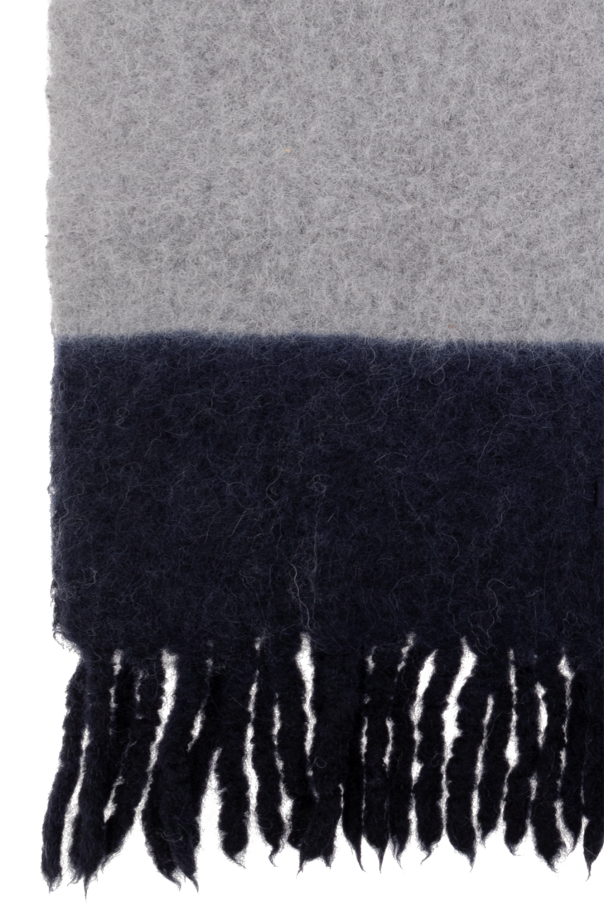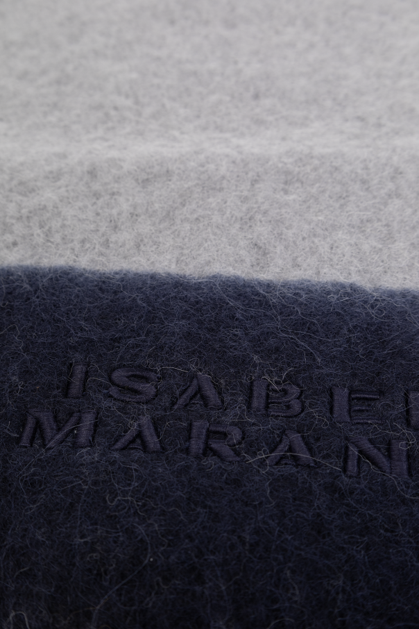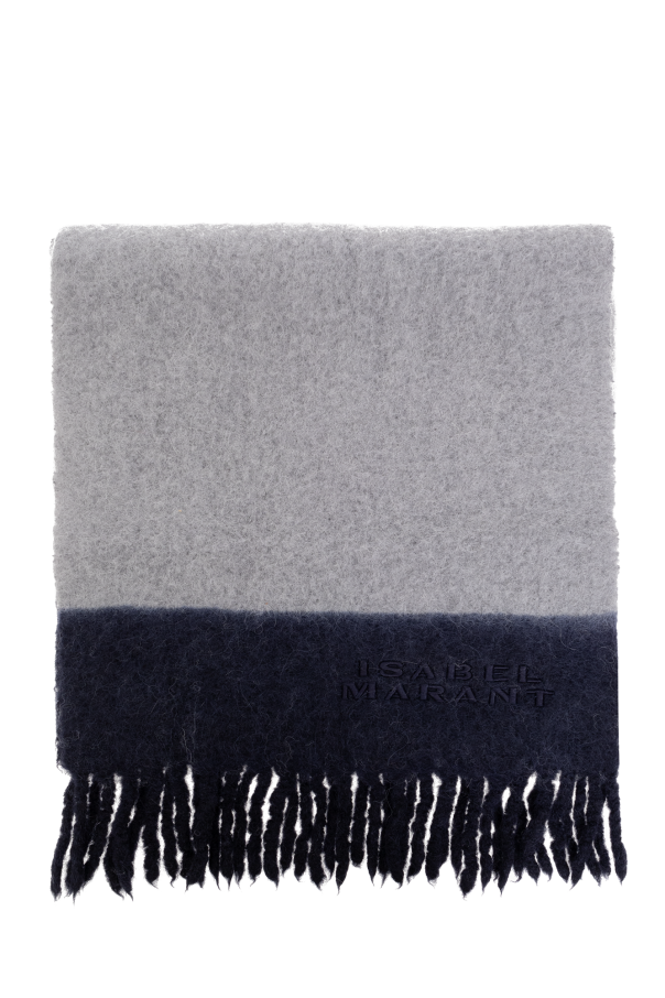 Grey and navy ‘Firny’ scarf from Isabel Marant. Made of alpaca wool, this item is enriched by a logo embroidery and fringe edges.