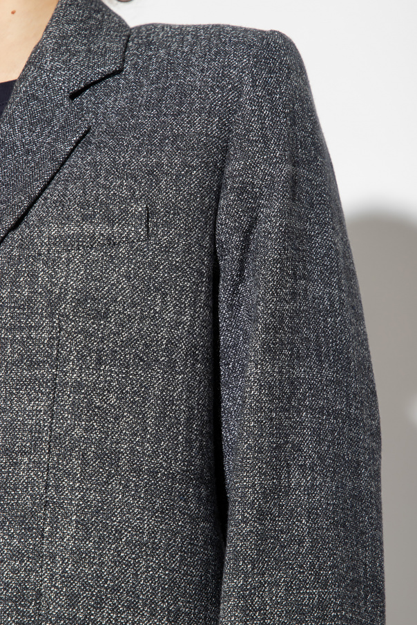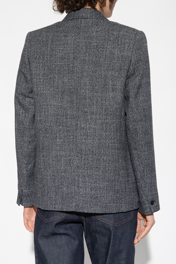 Navy blue, grey and white ‘Boyfriend’ single-breasted blazer from A.P.C. Crafted with a relaxed fit, this style features button fastenings, a collar with notch lapels, three slip pockets and long sleeves with button cuffs.