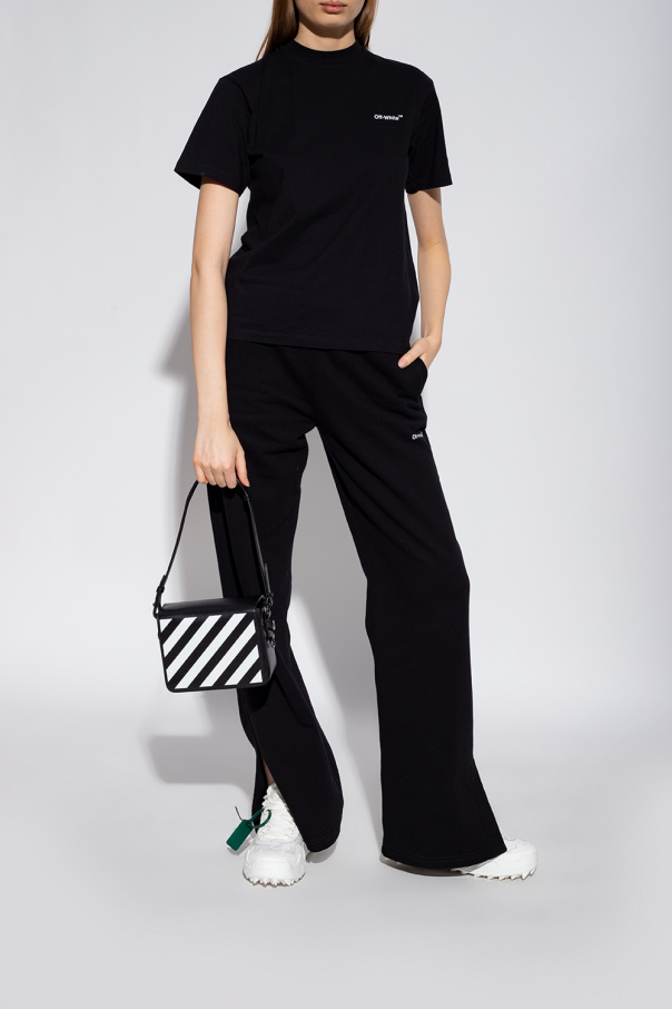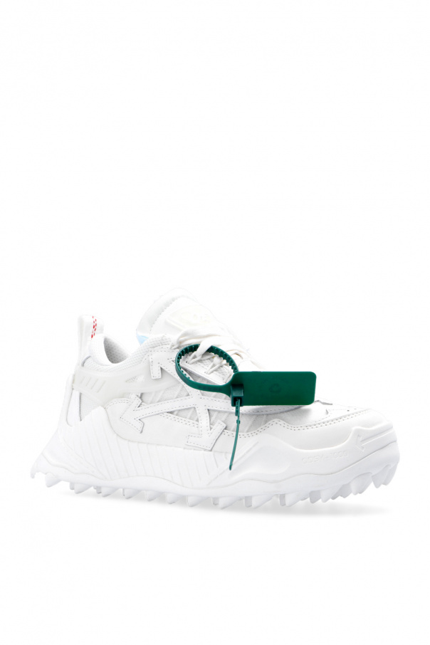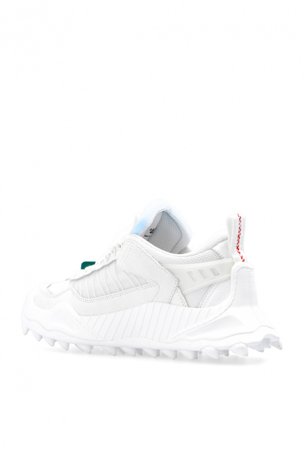 White ‘Odsy-1000’ sneakers from Off-White. Made of leather and rubber, this lace-up model showcases a black logo print, a dark green application and a white rubber sole.