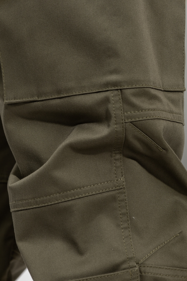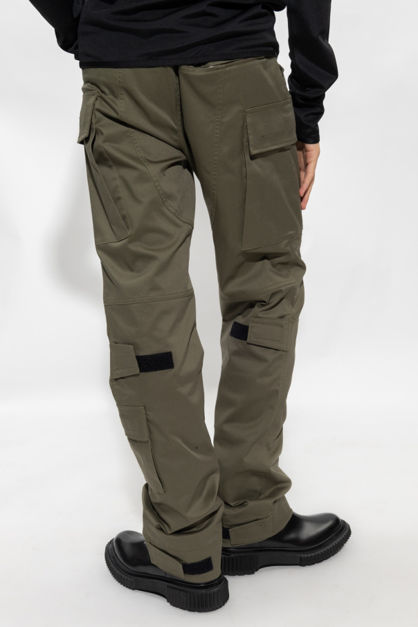 Dark green cargo trousers from 1017 ALYX 9SM. Made of a cotton blend, this pair features zip and velcro fastening, multiple pockets, decorative velcro straps, the brand’s signature metal appliqué and straight legs.