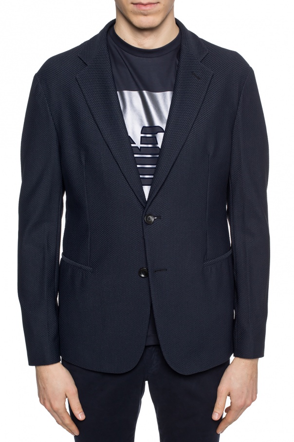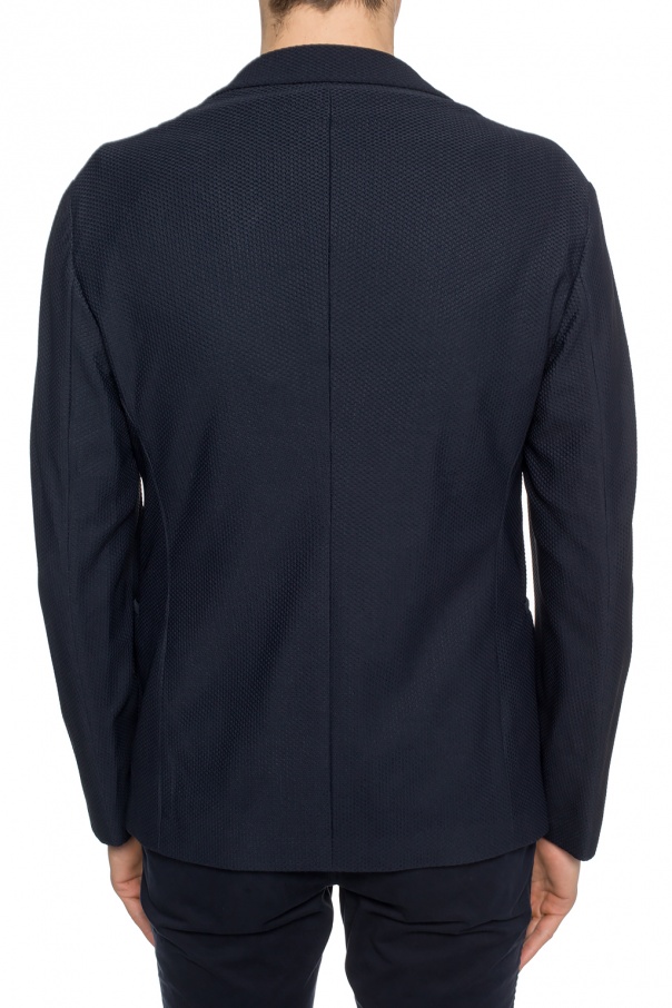 Navy patterned blazer with notch lapels from Giorgio Armani. Button fastening. Two slip pockets on the front. Long sleeves.