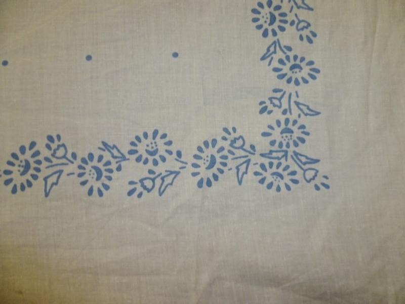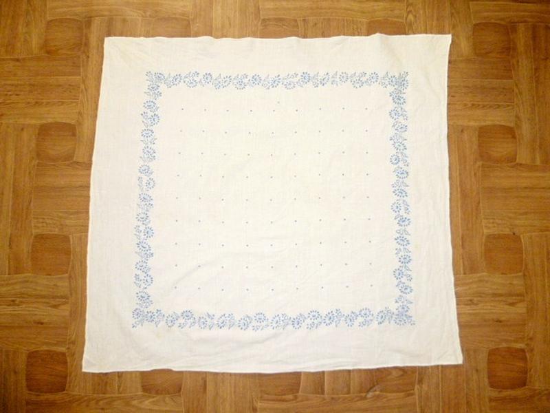 Белоснежный платок с синим рисунком из 100% хлопка-ткань вблизи на фото с лицевой и с изнаночной стороны.Состояние в общем отличное,но появились несколько желтоватых пятнышек при хранении(фото).Размер 75см/82см.