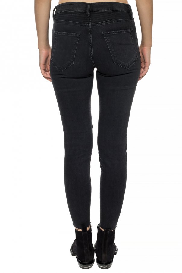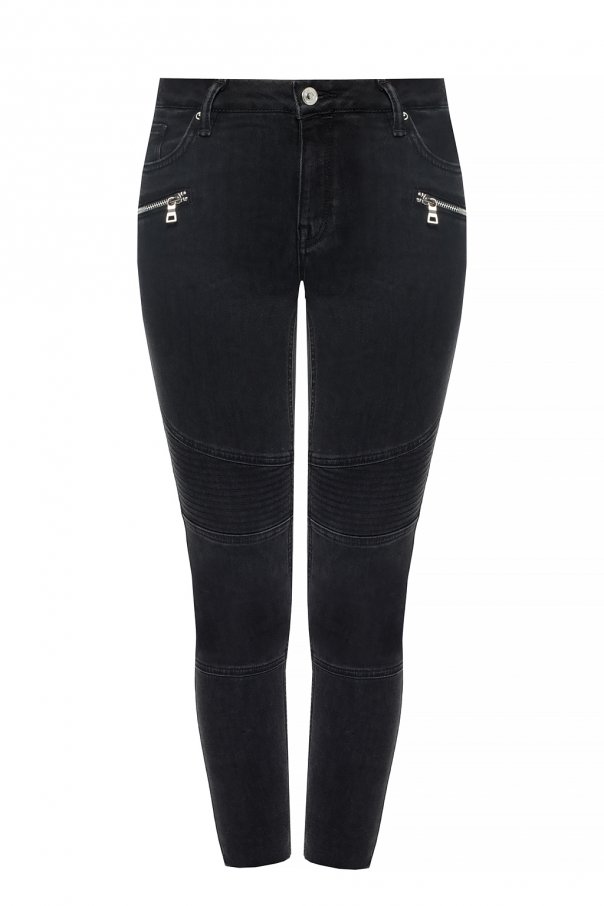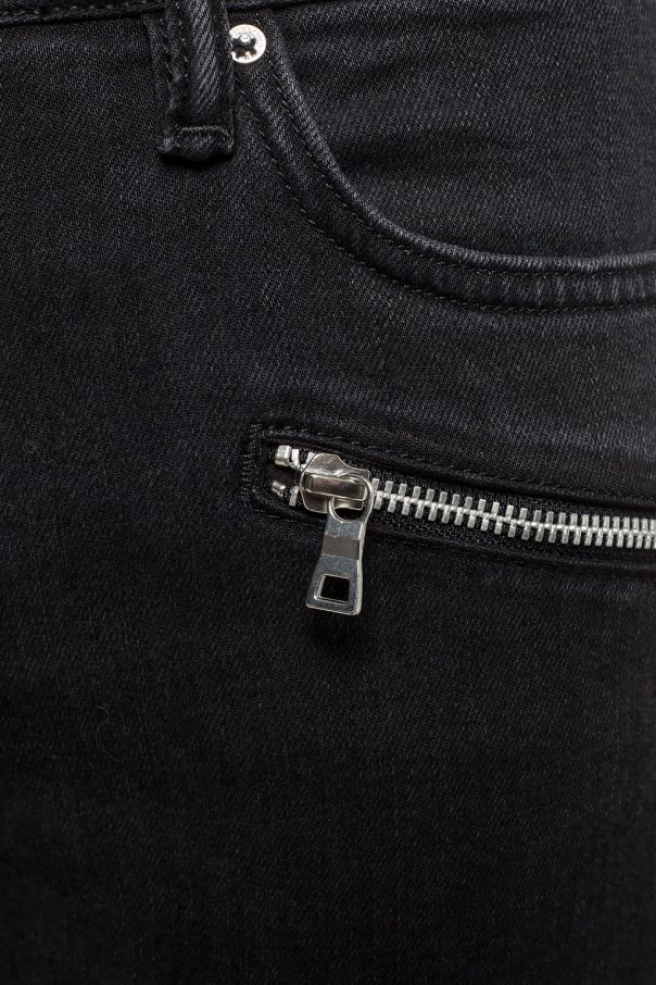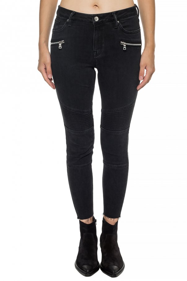 Black ‘Grace’ jeans with a raw trim from AllSaints. Fastened with a zip and a button. Decorated with stitching details and decorative zippers. Two slip pockets on the front and at the back. Tapered legs.