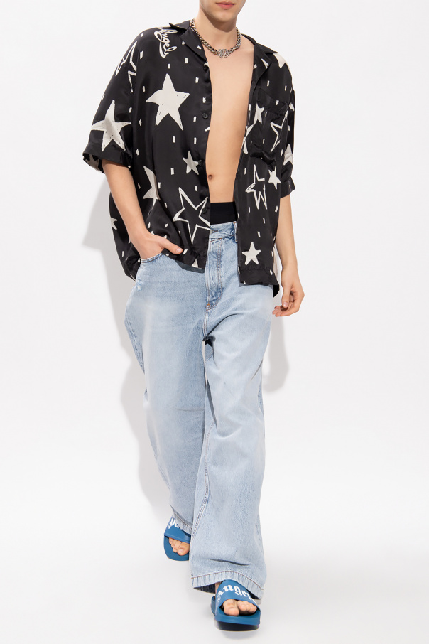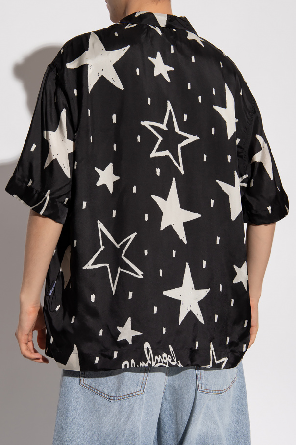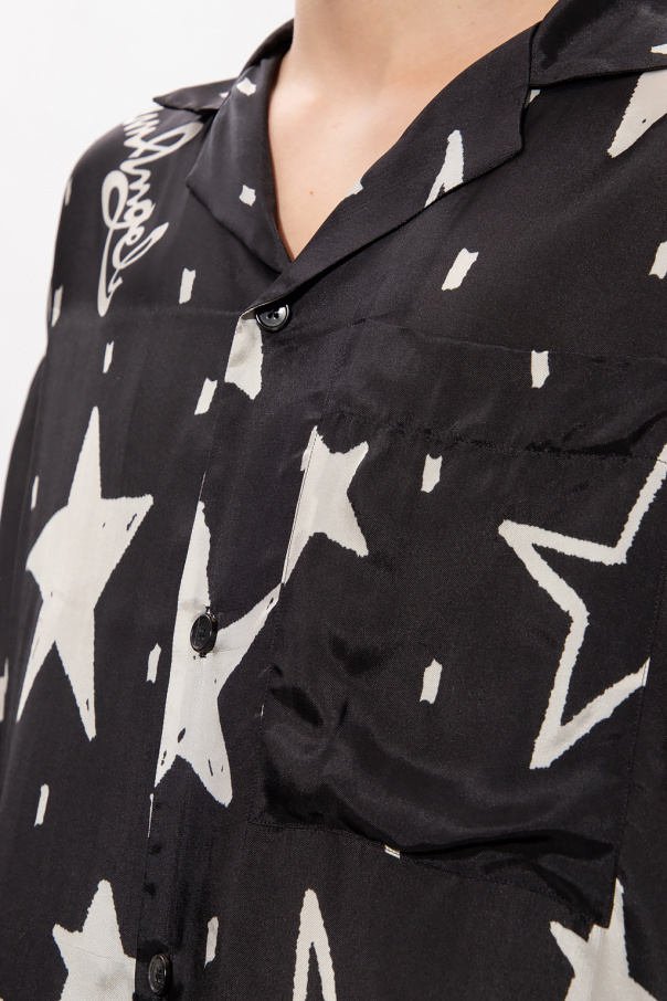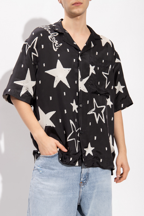 Black and white glossy shirt from Palm Angels. Fastened with buttons, this short sleeve design features a logo detail, star pattern and front pocket.