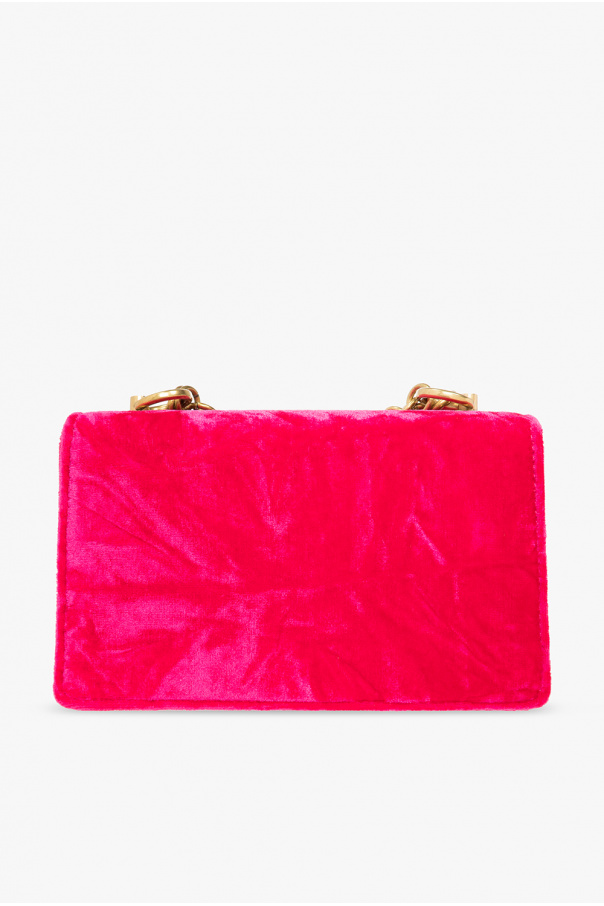 Dark pink shoulder bag from Versace Jeans Couture. Rendered in velvet fabric, this design secures with snaps and features a metal logo plaque on the front, an adjustable chain strap accentuated with logo charms, antiqued gold-tone metal hardware and two separate compartments and one slip pocket inside.