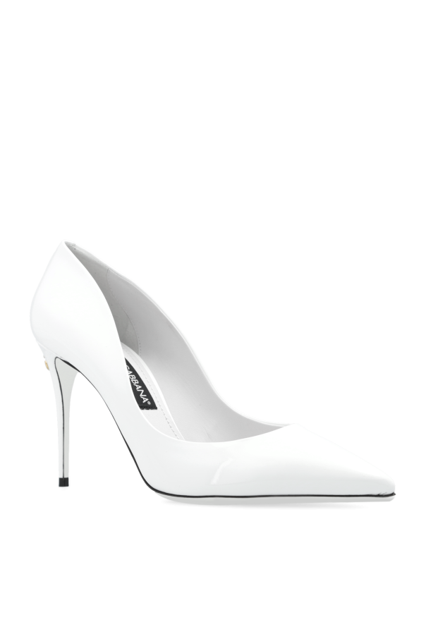 White ‘Cardinale’ pumps from Dolce & Gabbana. Made of patent leather, this pair sits on a white rubber sole and features a pointed toe and a gold-tone logo detail.