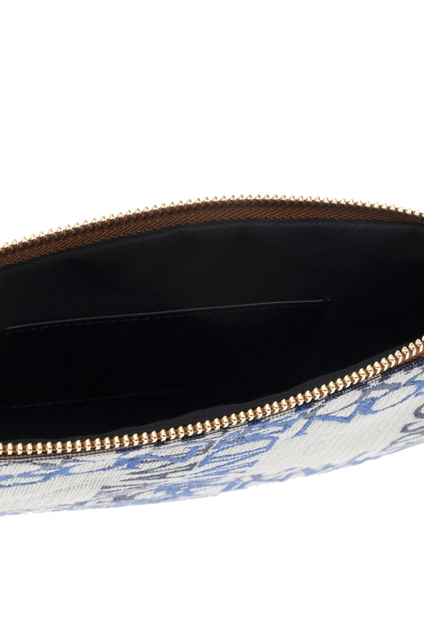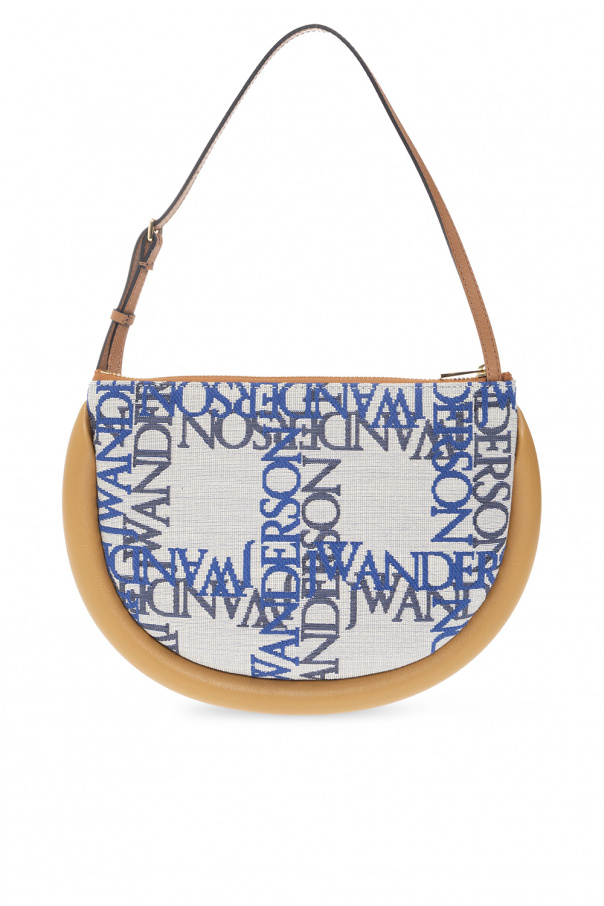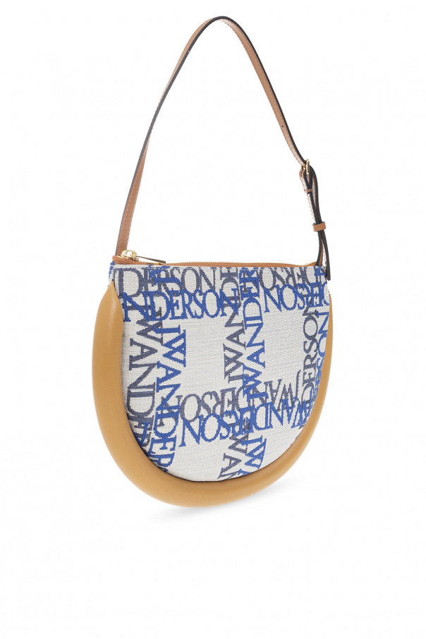 Light grey ‘The Bumper Moon’ hobo bag from JW Anderson. Crafted from cotton, this design features a zip fastening, brown leather trims, a blue and navy blue embroidered logo pattern, an adjustable half-round handle, gold-tone metal hardware and one internal compartment with a card slot.