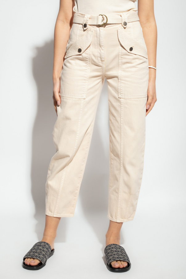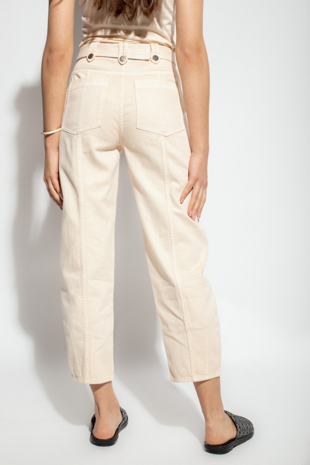 Cream ‘Waverly’ jeans from Ulla Johnson. Cut with a high-waisted silhouette, this pair features a zip fly with a button, a belt with an antiqued gold-tone buckle, four slip pockets and tapered legs.