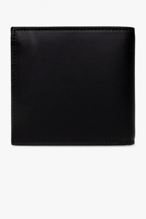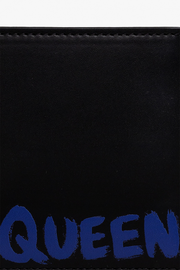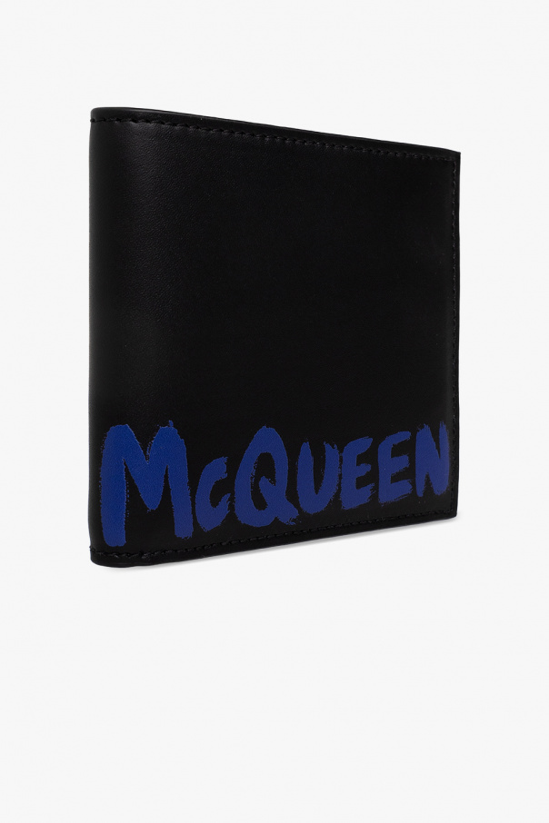 Black bifold wallet from Alexander McQueen. Crafted from calf leather, this model is decorated with a dark blue logo print and has two bill compartments, two slip pockets and eight card slots.