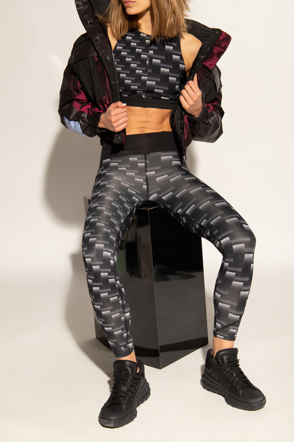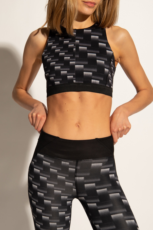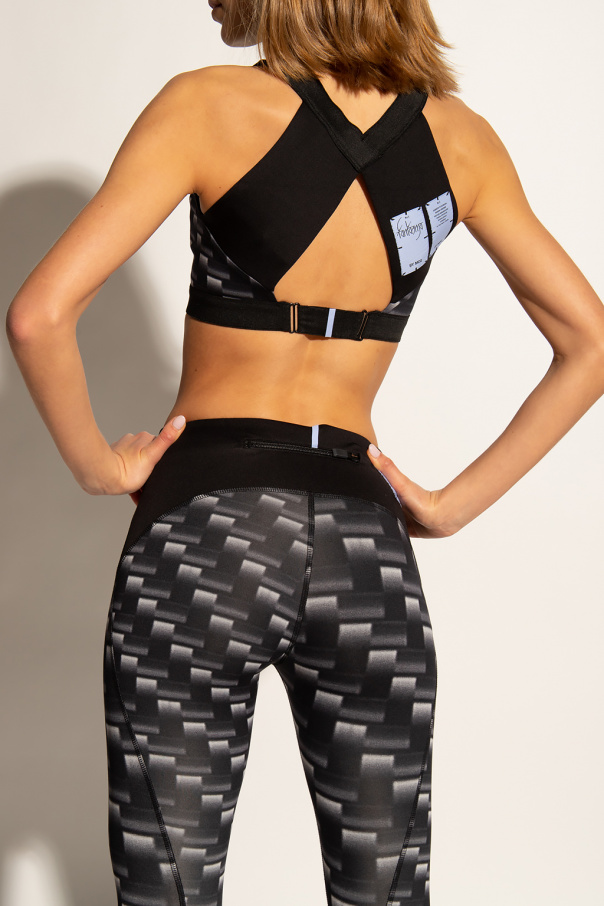 Black and grey top from Fantasma by MCQ, the ‘No. 5’ collection. Made of a cotton blend with a cropped fit, this style showcases purple logo patches, a printed pattern and a cut-out back.