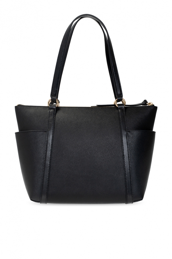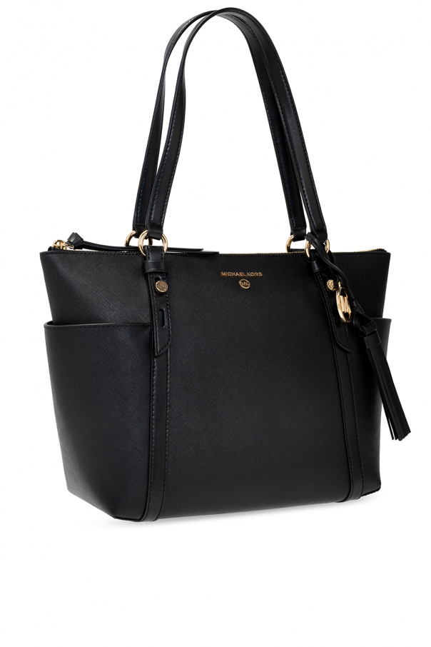 Black ‘Sullivan’ handbag from Michael Michael Kors. Crafted from leather, this design fastens via a zip and showcases a logo plaque, two half-round handles, two slip pockets on the sides, gold-tone metal hardware and one internal compartment with four slip pockets and one zip pocket.