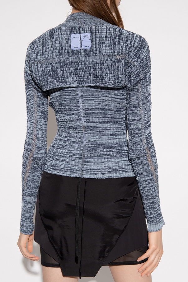 Blue and navy ribbed two-layered top with straps from Striae by McQ, the ‘No.10’ collection. Made of cotton, this design features decorative cut-outs, logo patch at the back, ribbed collar and detachable lining. Can also be worn as a sleeveless top. Inspired by DIY processes and horticulture, McQ uses organic dying techniques.