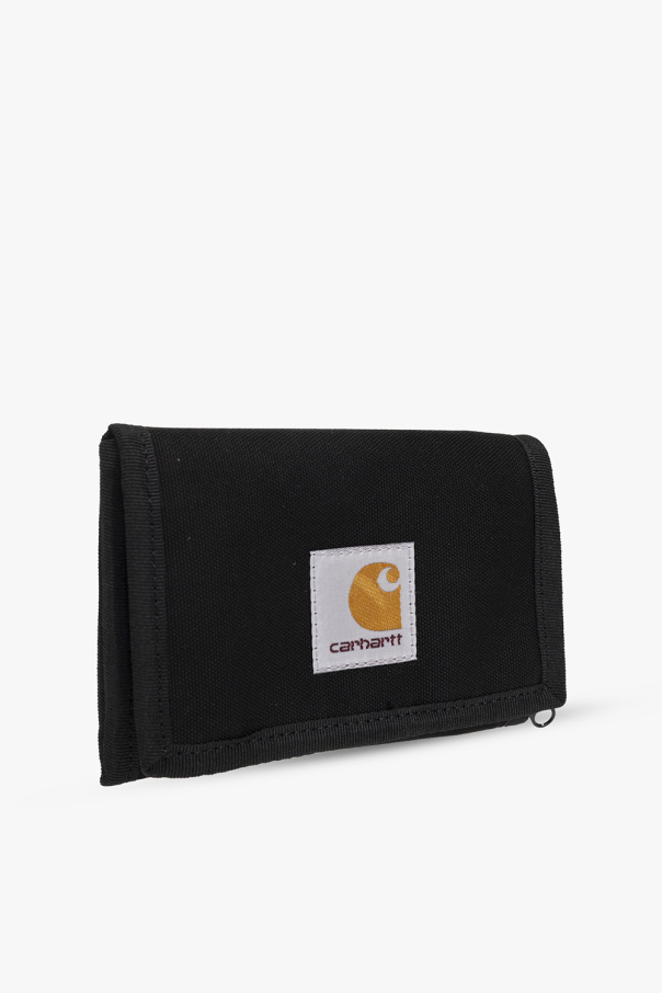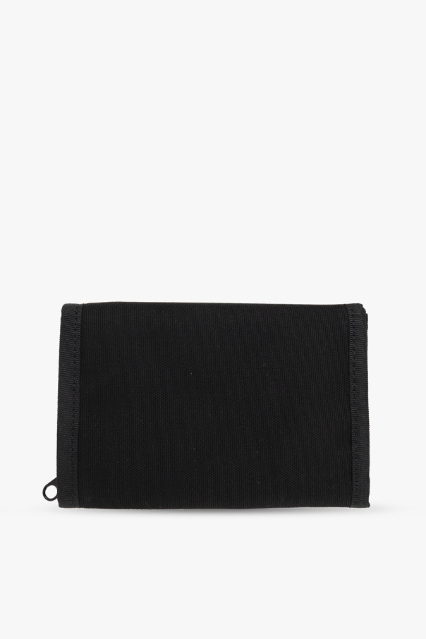 Black ‘Alec’ wallet from Carhartt WIP. Made of recycled fabric, this item fastens with velcro and is decorated with a logo patch. It has a zipped bill compartment, coin pocket with velcro fastening, two slip pockets and four card slots.