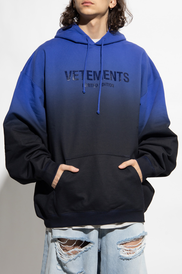 Black and blue hoodie from VETEMENTS. Made of cotton, this design features a drawstring hood, decorative gradient effect, rubberized logo, front pocket and ribbed trims.
