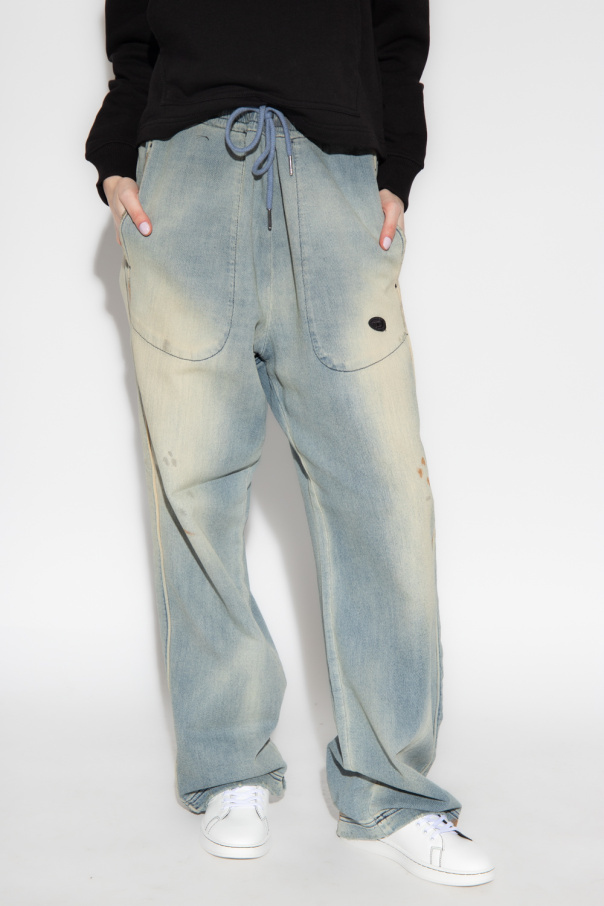 Blue ‘D-MARTIANS-NE’ jeans from Diesel. Crafted in JoggJeans with a vintage effect, this pair falls with wide legs and features a drawstring waistband, classic five pockets and a black logo patch on the front.