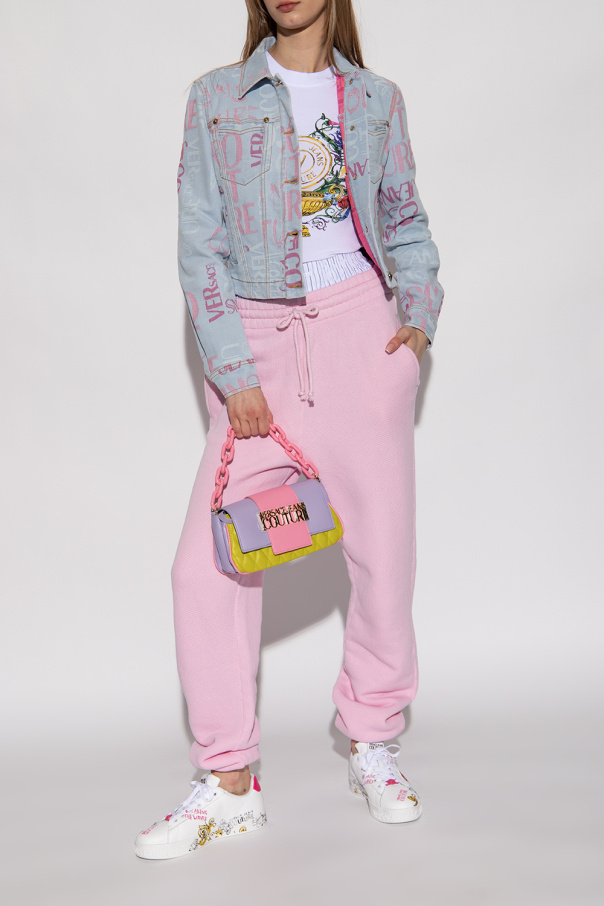 White ‘Court 88’ sneakers from Versace Jeans Couture. Crafted from leather and trimmed with fabric overlays, this lace-up model sits on a white rubber sole and showcases a colourful graphic print, logo detailing, rose embroidery and a pink heel counter.