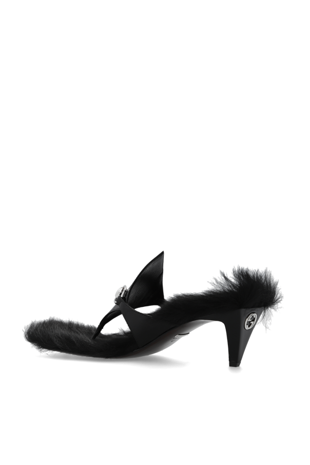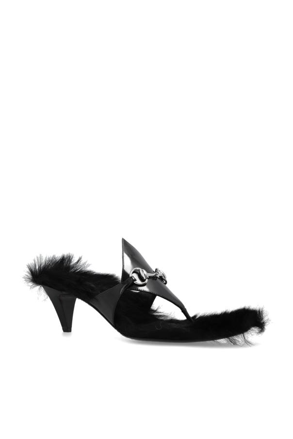 Black mules from Gucci. Made of patent leather and lined with lambswool, this model sits on a dark brown leather sole and showcases the brand\'s signature silver-tone horsebit hardware and a cone-shaped heel accentuated with a logo application.