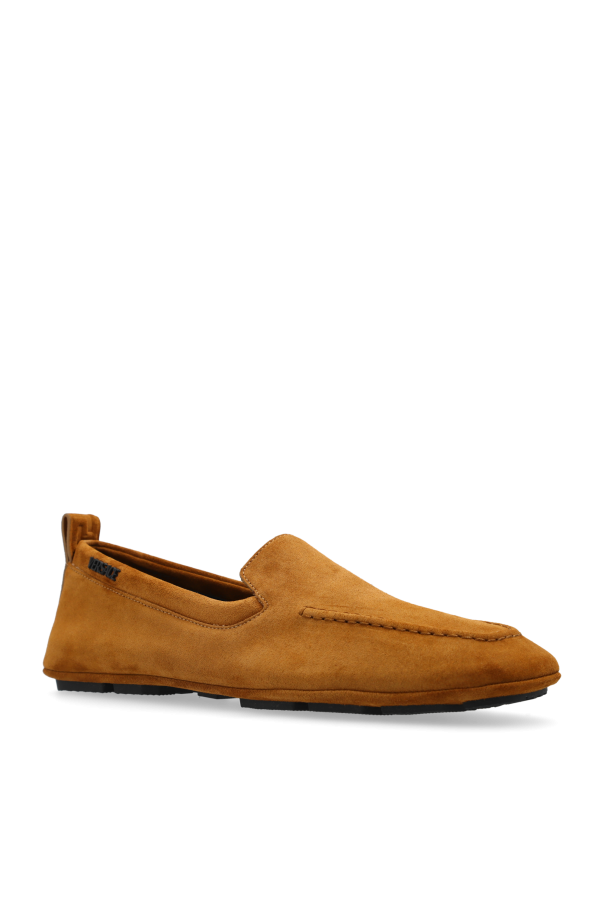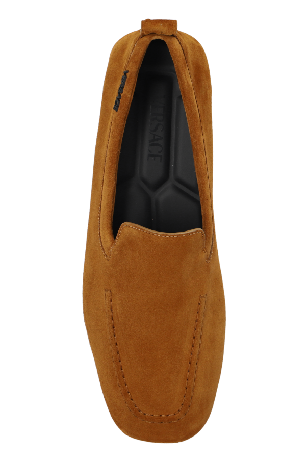 Introducing the epitome of refined elegance and comfort with our Versace Leather Moccasins. Crafted from the finest suede leather, these moccasins exude a luxurious, matte finish that is both sophisticated and understated. The classic, tapered silhouette with a rounded toe offers timeless appeal, while a discreetly placed designer logo on the upper side signifies the authenticity and esteemed craftsmanship of Versace. The interior is lined with soft leather, ensuring your feet are enveloped in comfort throughout the day. The flexible rubber sole features distinct lines for enhanced grip, marrying functionality with finesse. The absence of laces underscores the shoe\'s versatility and casual elegance, making it effortless to slip on for any occasion. Rendered in a rich brown hue, these moccasins are not just footwear but a statement of style that complements a myriad of outfits, seamlessly transitioning from casual daily wear to more formal settings. Why Purchase This Product? Superior Craftsmanship: Authentic Versace design with premium materials. Timeless Elegance: Classic design that transcends seasonal trends. Versatility: Perfect for any occasion, easily paired with diverse styles. Unmatched Comfort: Soft interior lining and a flexible sole for all-day wear.