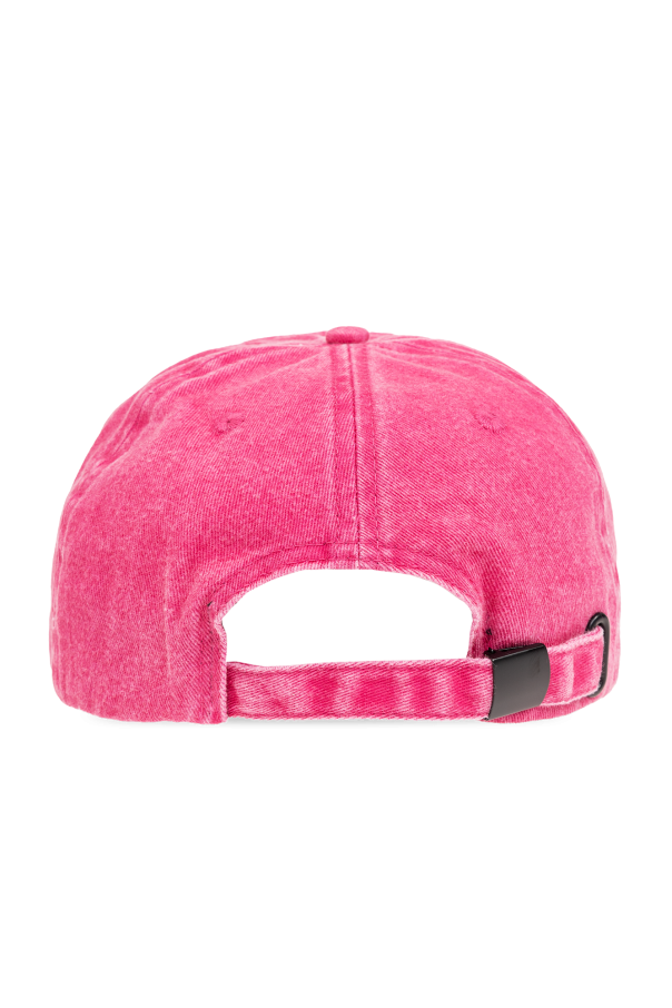 Pink baseball cap from Versace Jeans Couture. Made from cotton with distressed details, this item adjusts via a buckle strap on the back and showcases an embroidered white, black and pink logo on the front.
