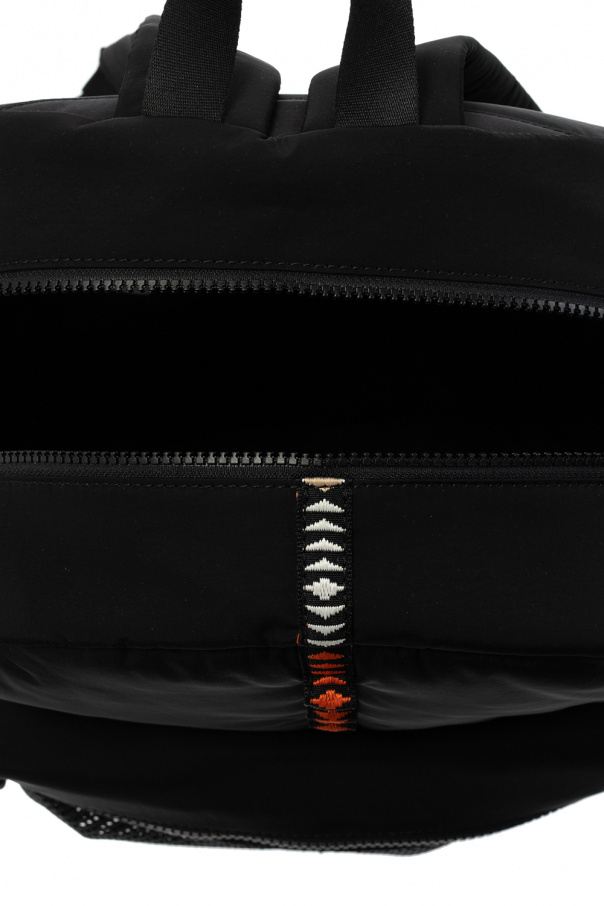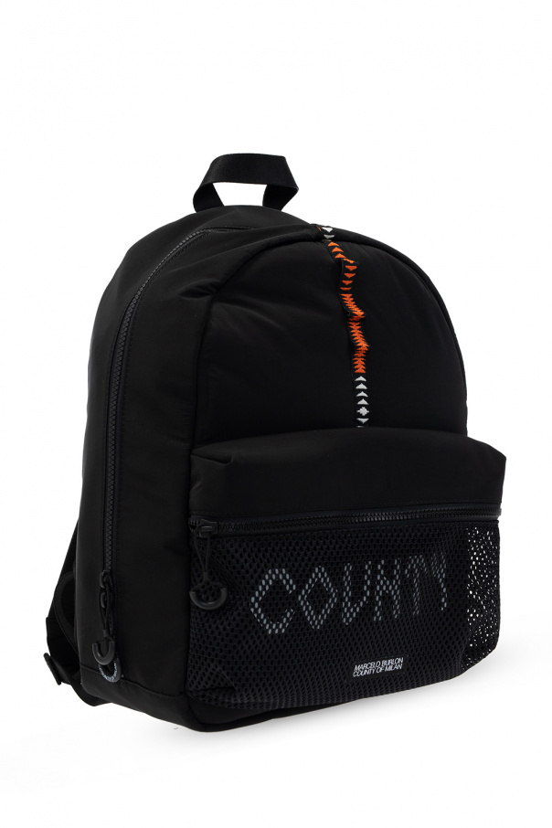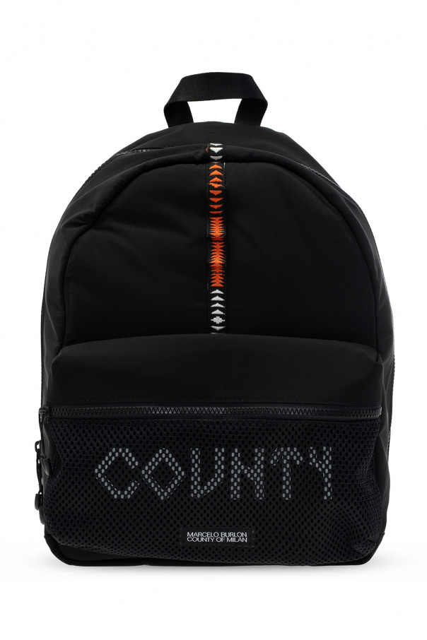 Black backpack from Marcelo Burlon. Fastened with a two-way zip, this design features a transparent zip pocket, a logo patch and an embroidered orange and white logo pattern on the front, a half-round handle, adjustable shoulder straps and one internal compartment.
