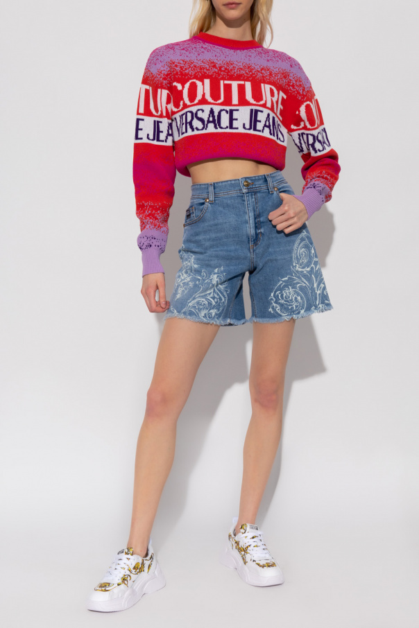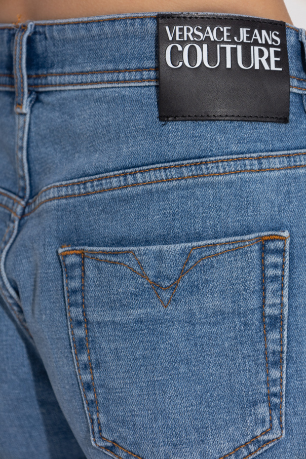 Blue denim shorts from Versace Jeans Couture. Made of cotton, this garment features a zip and button closure, white print, black and white logo-embossed patch, five slip pocket and raw cut edges.