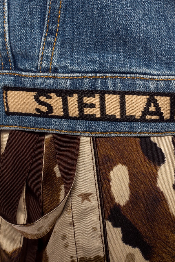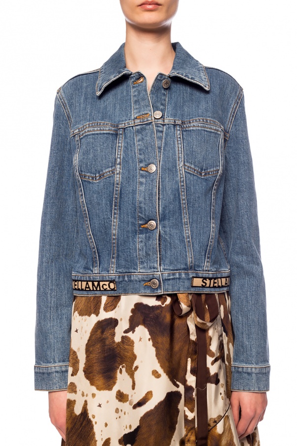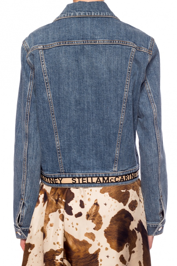 Blue denim jacket from Stella McCartney featuring button fastening, long sleeves, 2 slip pockets on the front and beige jacquard hem with logo.