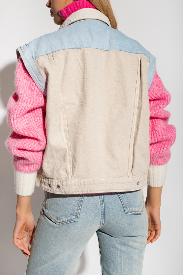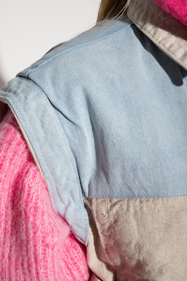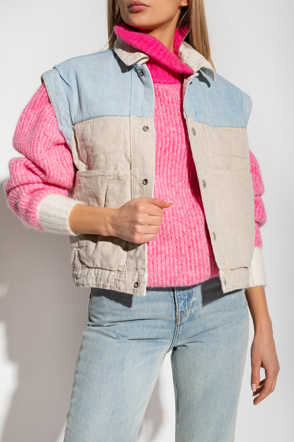 Cream and light blue reversible vest from Levi’s, the ‘WellThread™’ collection. Crafted from a blend of cotton and hemp, this style employs snap fastenings and tab adjusters at the hem. One side has a red logo tag, two welt pockets and two snap-fastened flapped pockets. The other side features a light blue top panel and two welt pockets.
