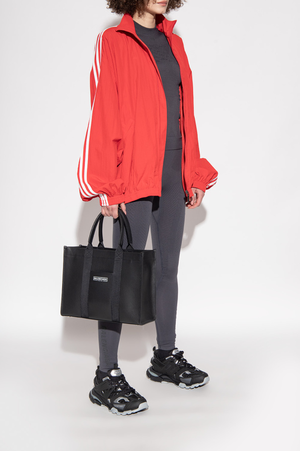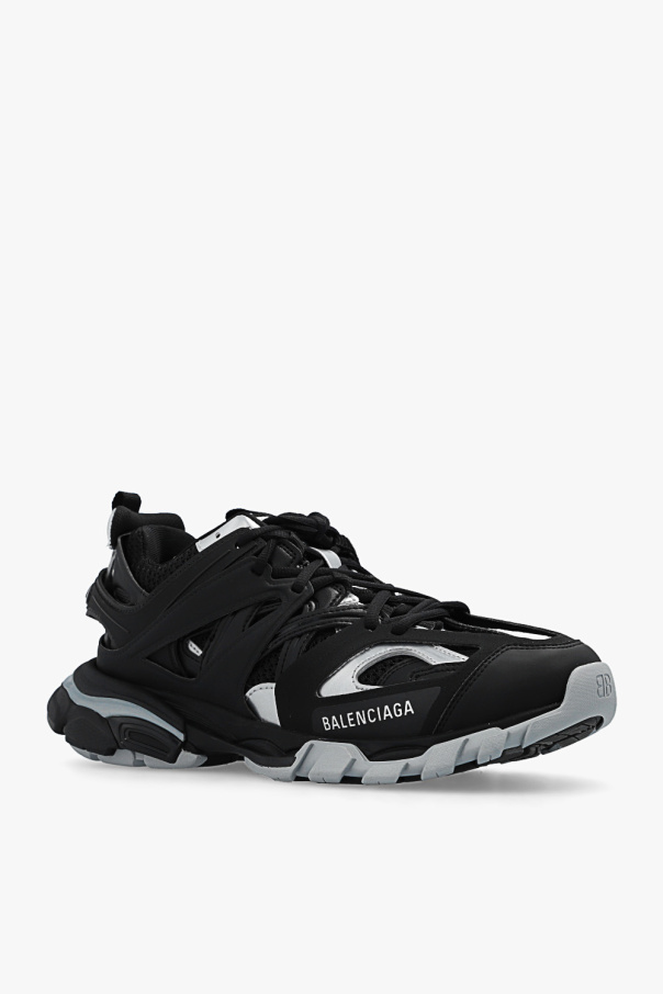 Black and grey \'Track\' sneakers from Balenciaga. Made of textured faux leather, this lace-up model sits on a grey rubber sole and features a printed silver-tone logo and a reflective, tactile appliqué at the back.